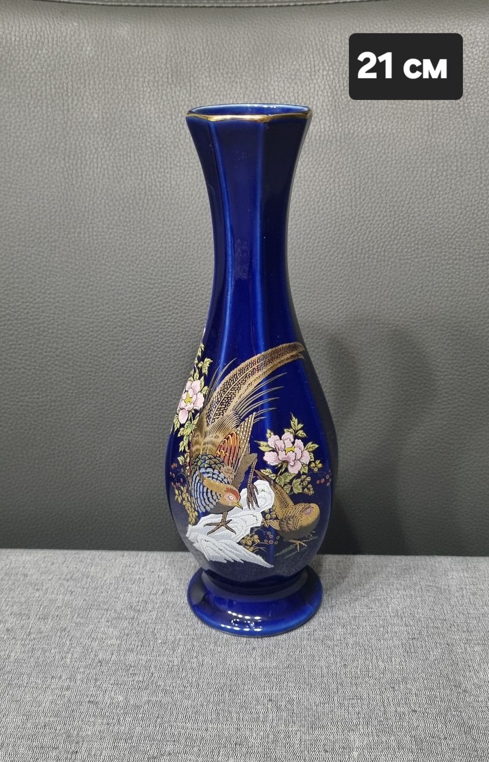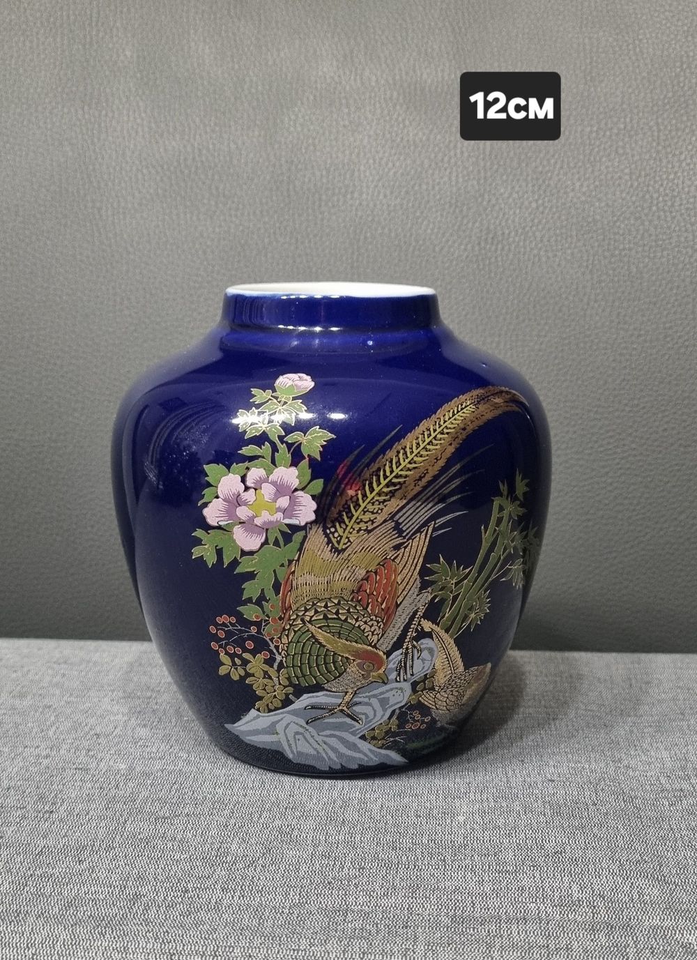Это винтажная кобальтовая ваза с изображением фазана и цветов пиона.