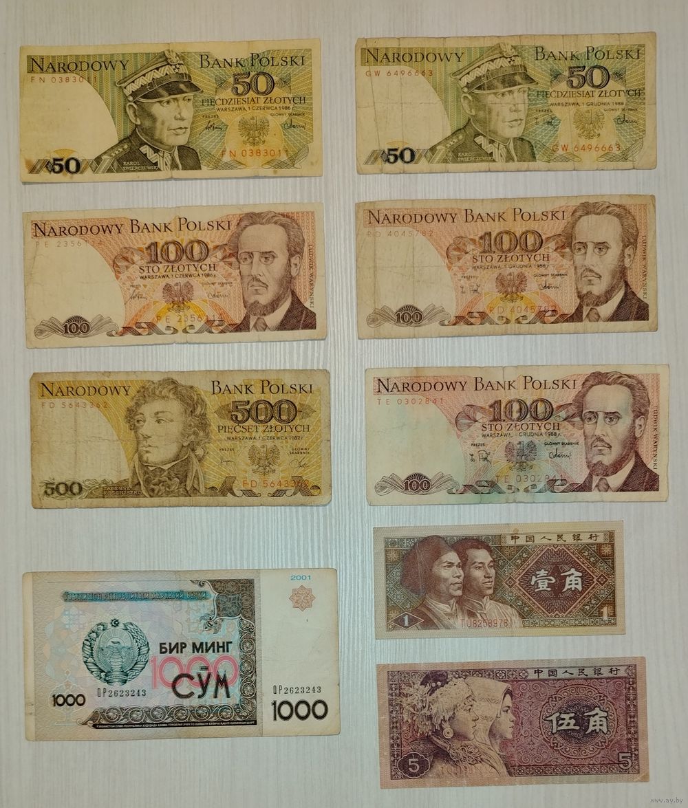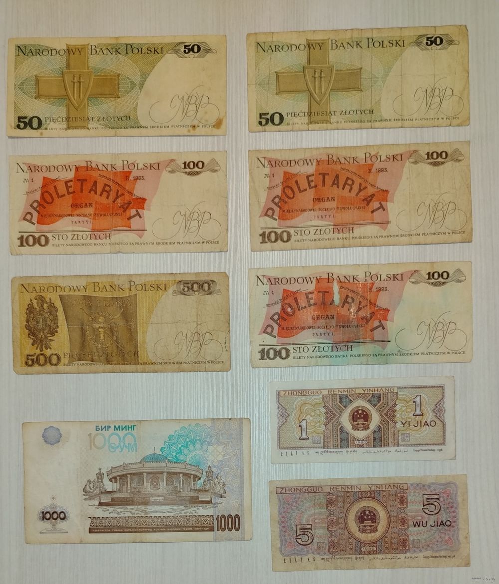 Лот из 9 банкнот (Польша, Китай, Узбекистан)