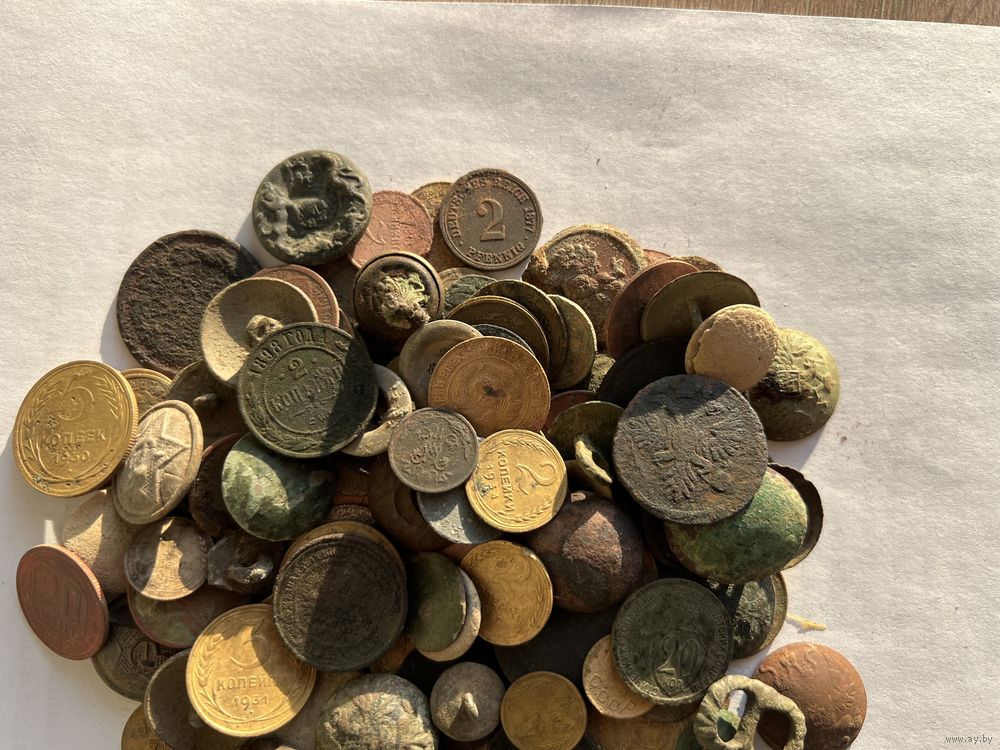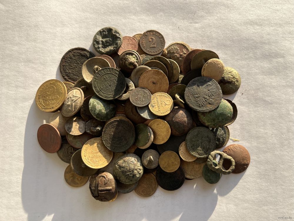 Монеты и пуговицы разных периодов. В основном не чищеные. Состояние на фото