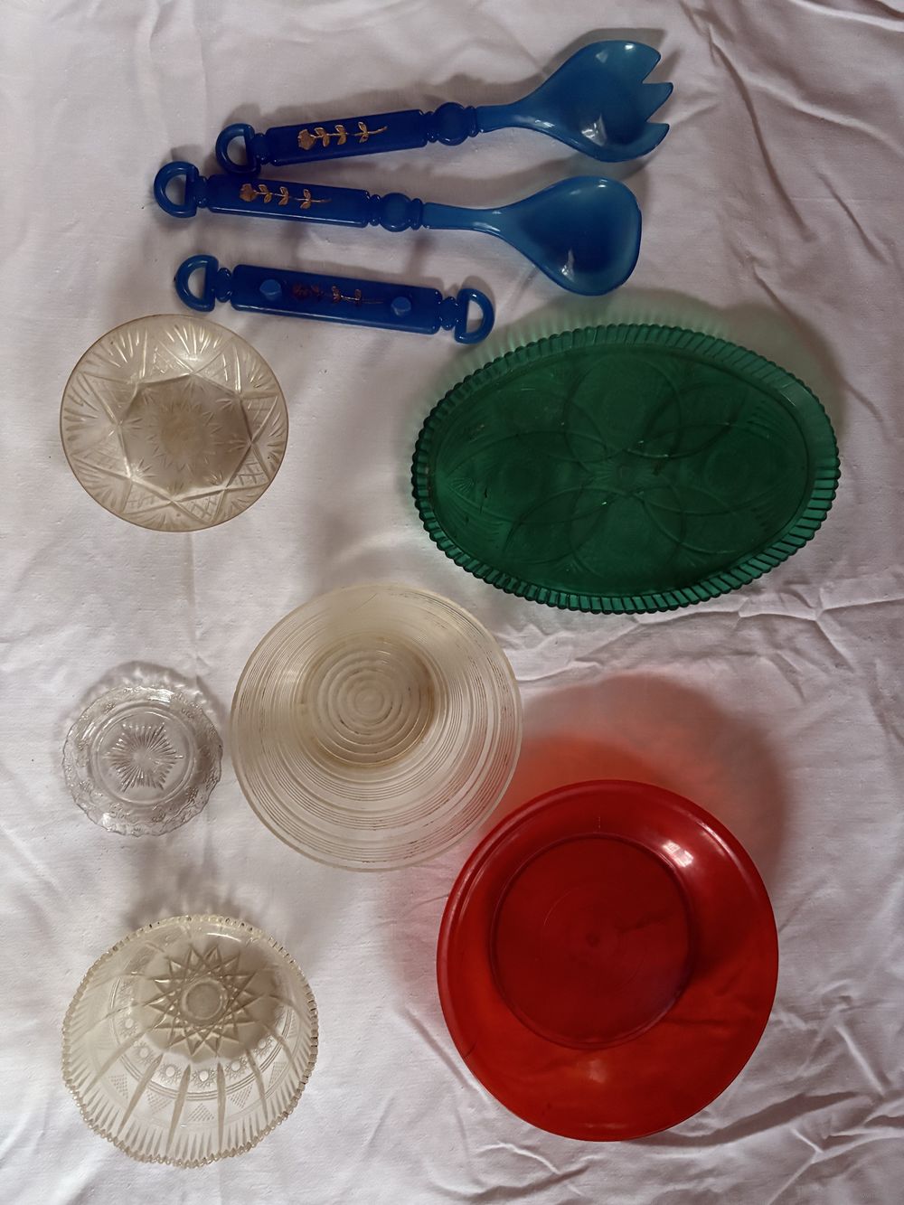 Лот пластмассовой посуды-тарелка,поднос,розетки,солонка и икорница.Без трещин,сколов и прочих дефектов.Бонус-набор пластмассовых ложек (приобретены в перестроечное время) для овощных салатов