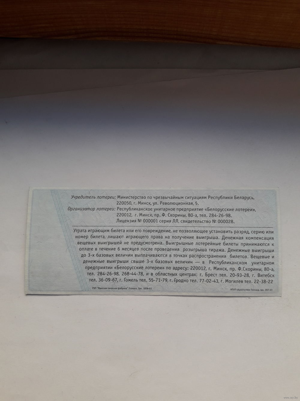 Лотерейный билет ДВЛ (МЧС РБ) 150 лет выпуск 1