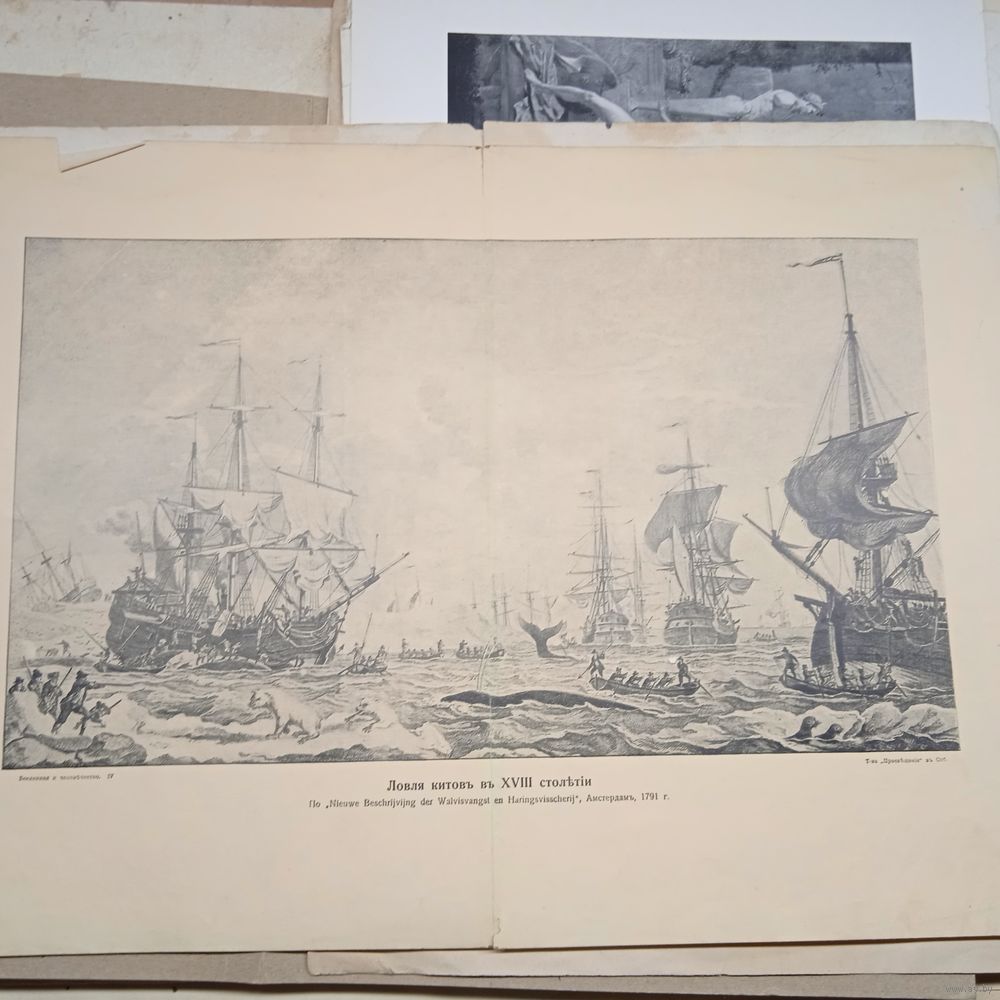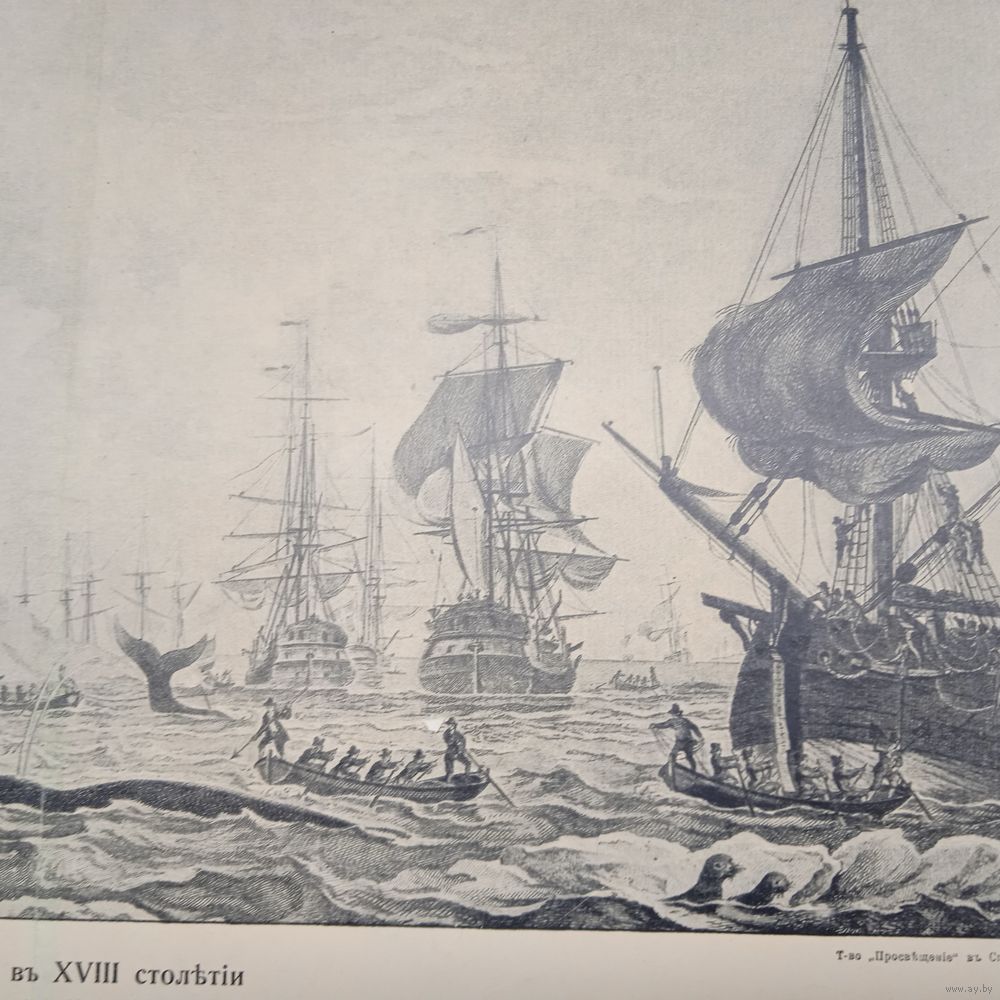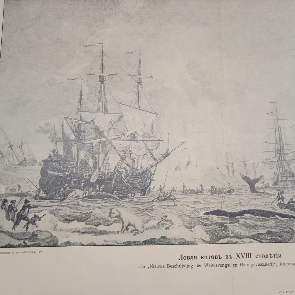 Ловля китов въ 18 столетии. Старинная литография 19-20века 38х28см. СПБ.