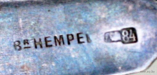 Клеймо Варшавского о пробирного управления с изображением женской головы в кокошнике, обращенная вниз, в щитке в фоме лопатки, с левой стороны стоит греческая буква йота "ι", в правой стороне стоит проба "84", именное клеймо "B-HEMPEL" - Клеймо братьев Хемпель.