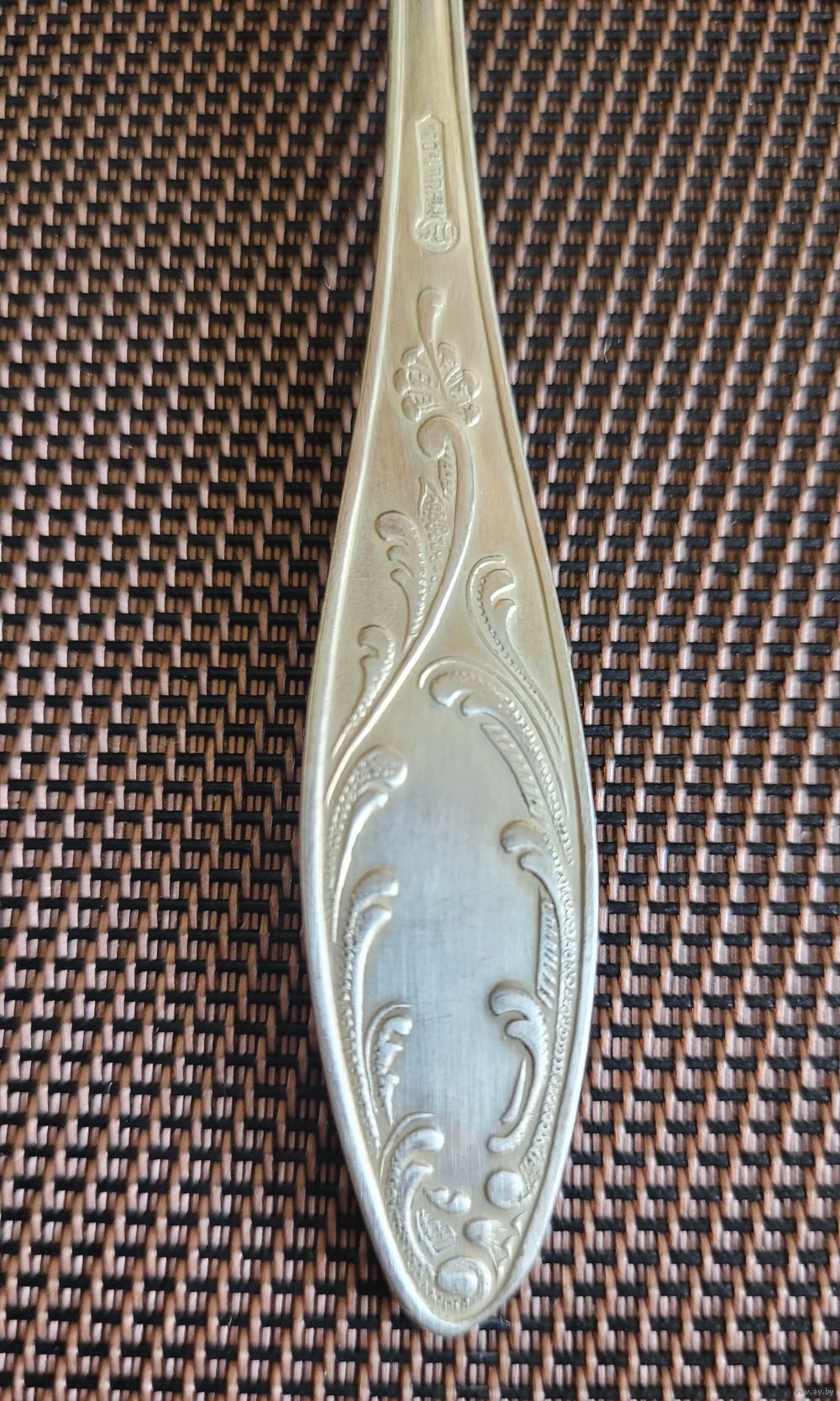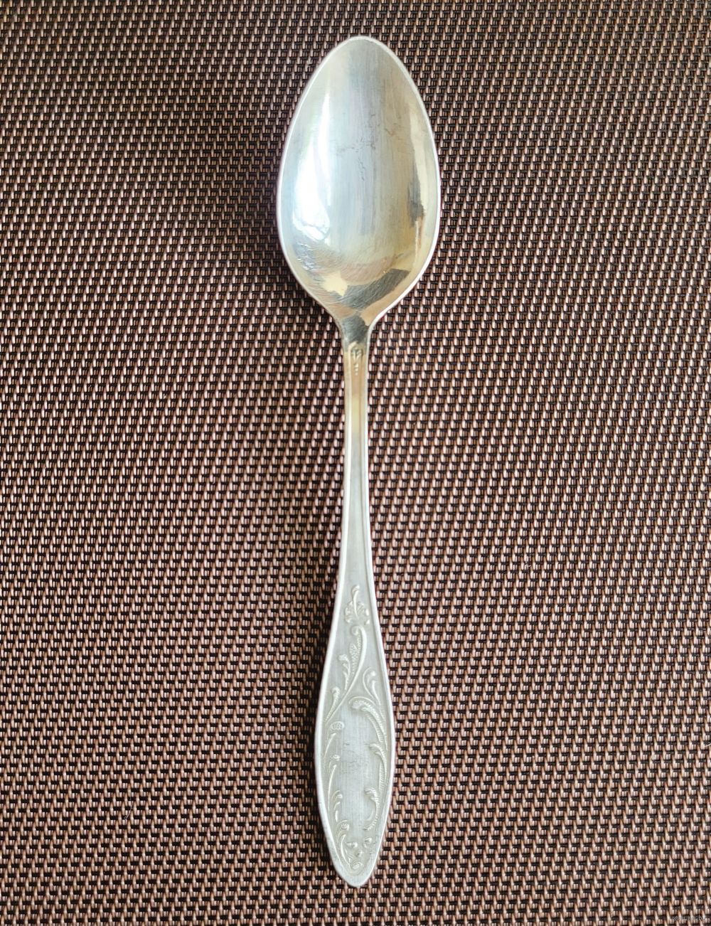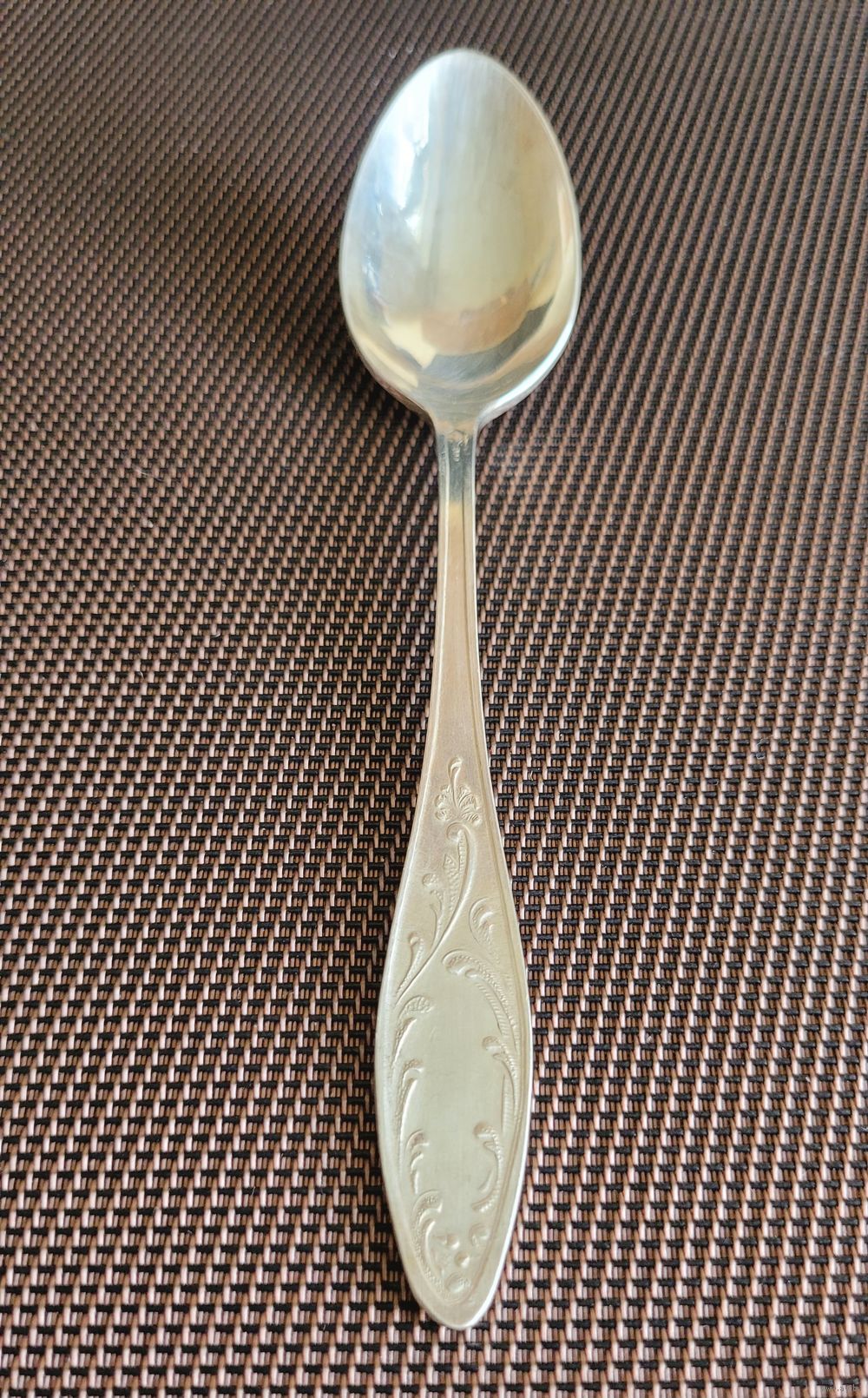 Ложка десертная "Пламя", 18 см, мельхиор, покрытие серебро. Оленегорский механический завод. Клеймо Олень, МНЦ, 1970-90 гг.