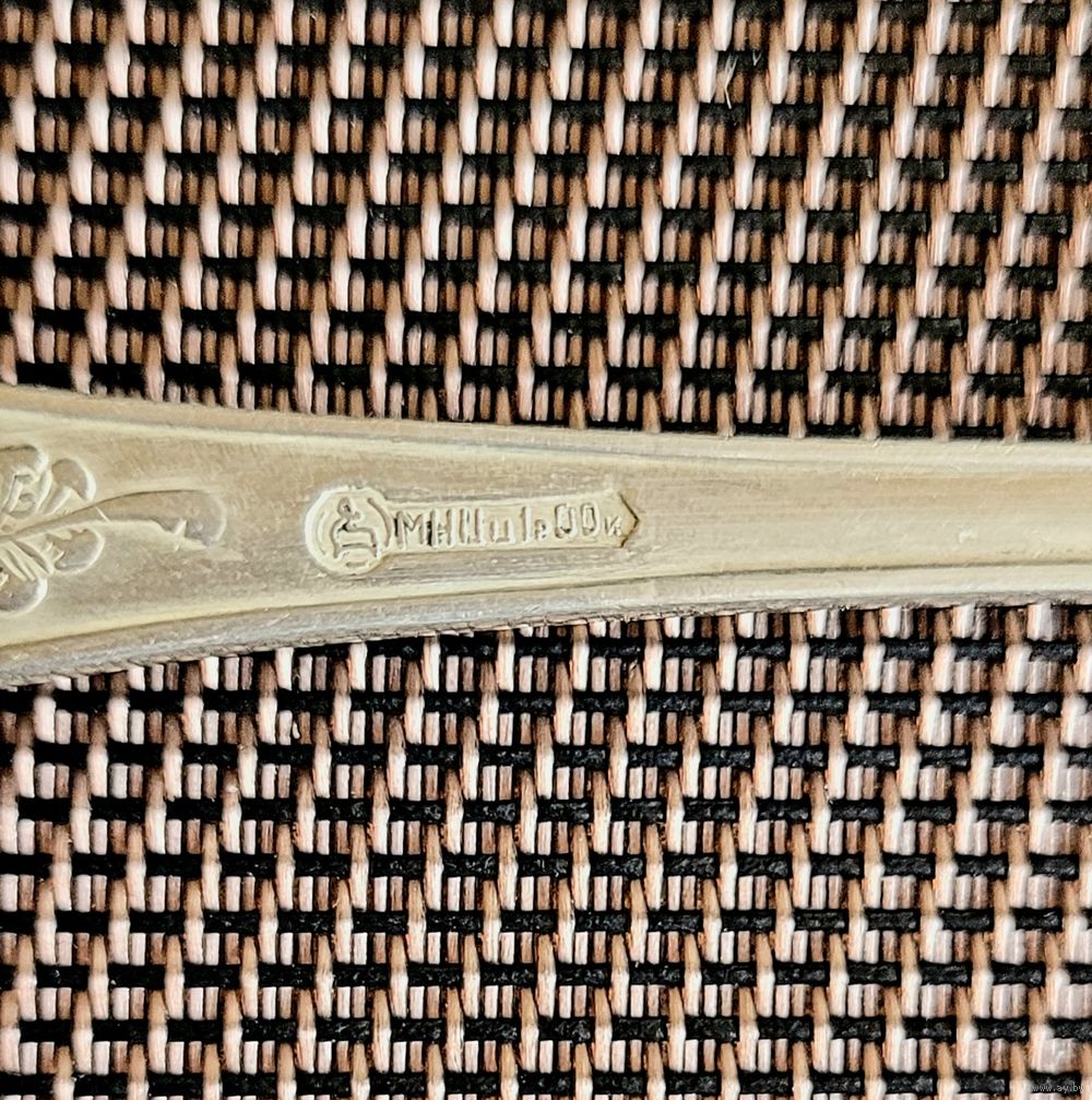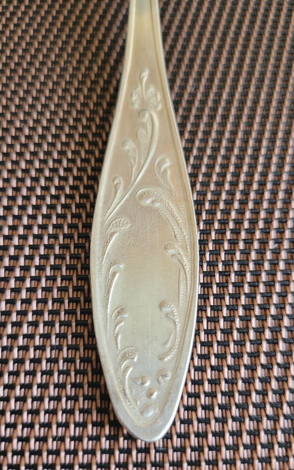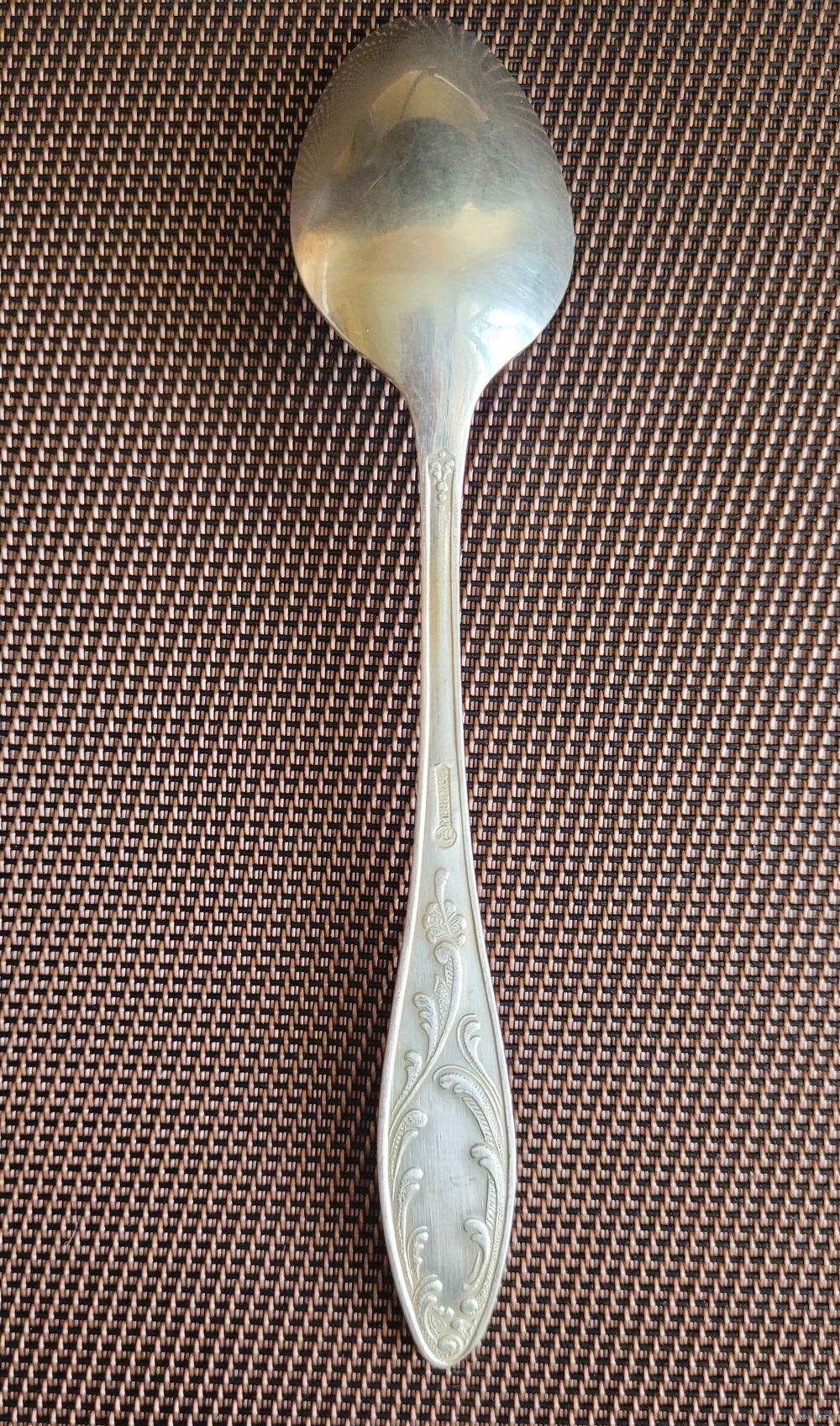 Ложка десертная "Пламя", 18 см, мельхиор, покрытие серебро. Оленегорский механический завод. Клеймо Олень, МНЦ, 1970-90 гг.