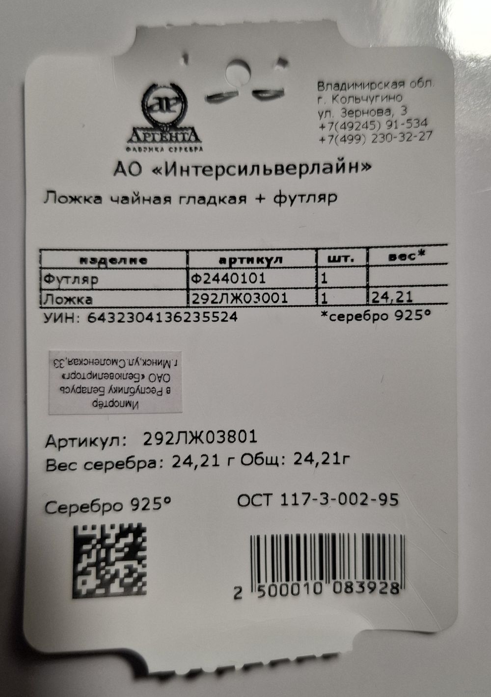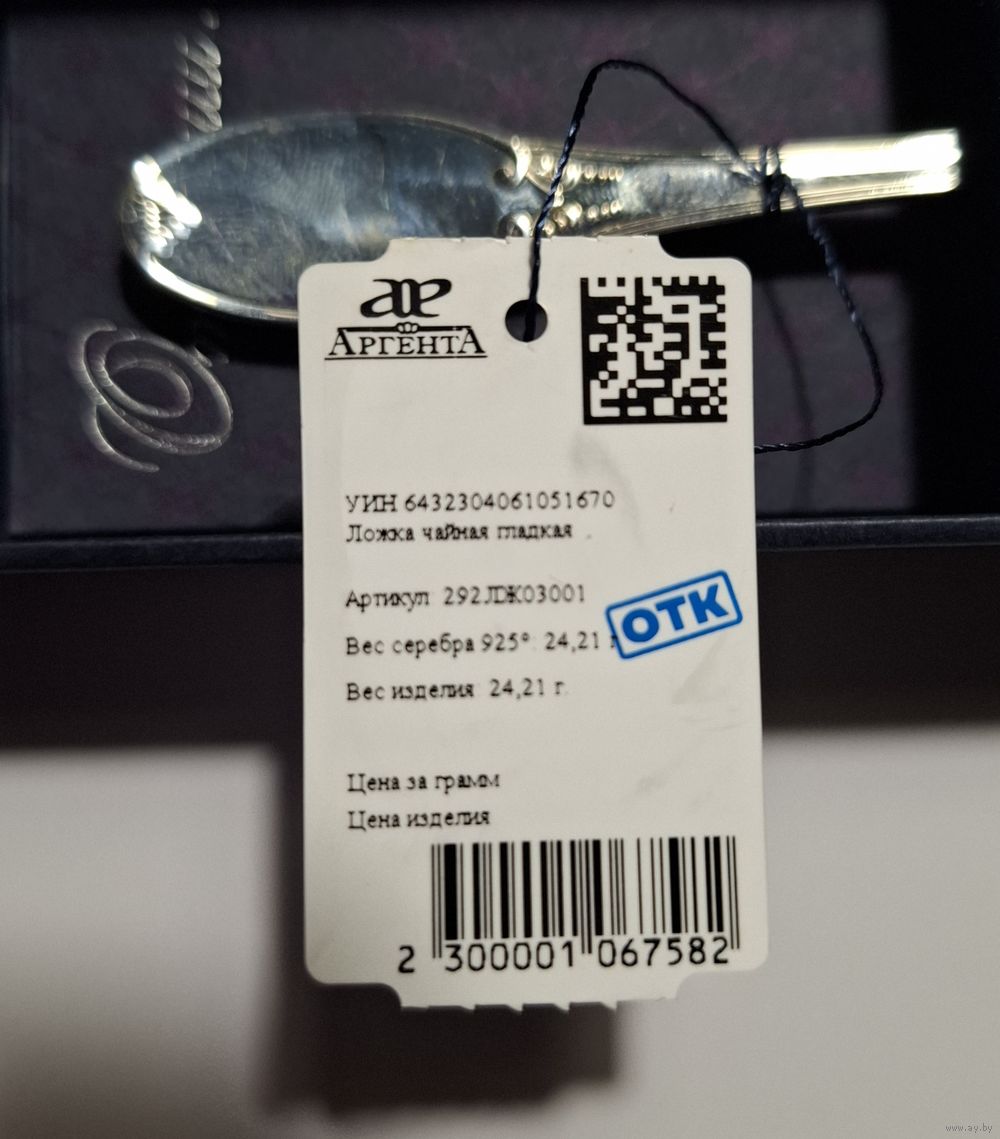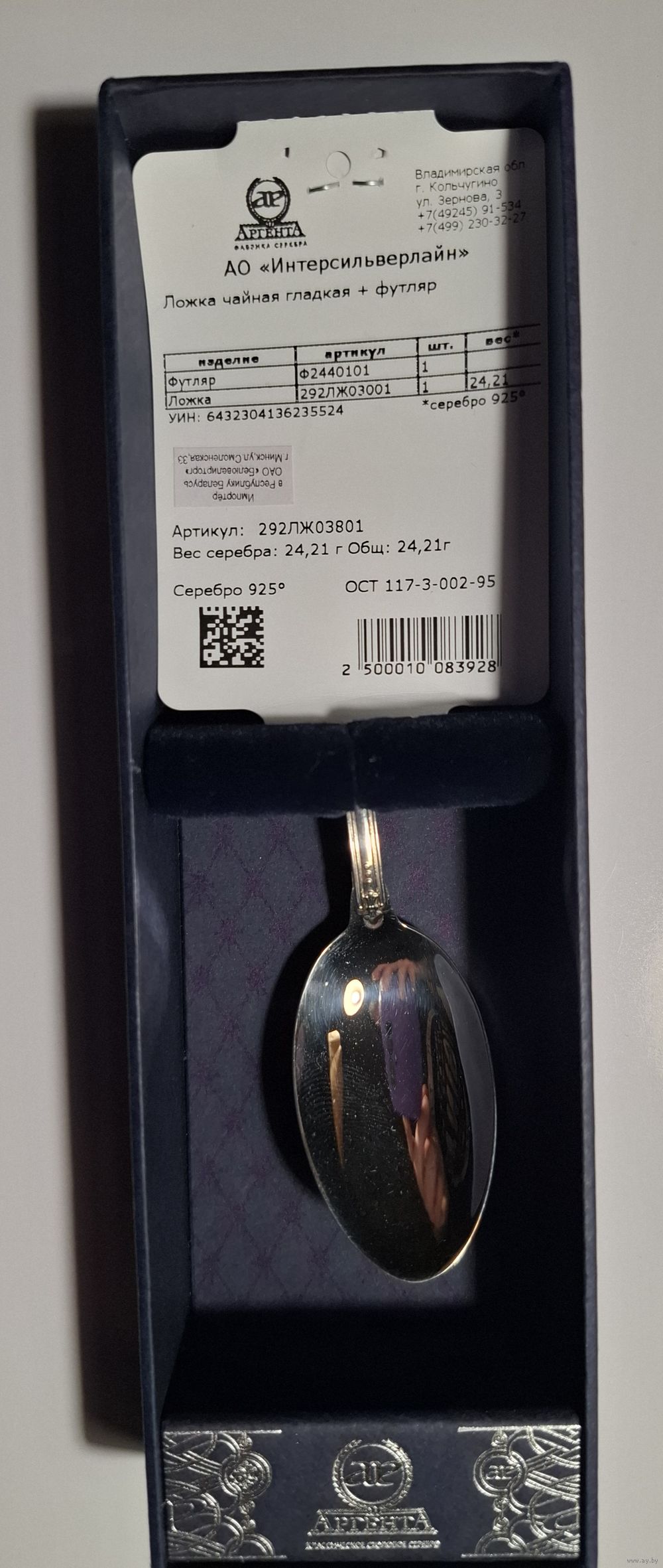 Ложка серебро 925 чайная (вес 24.21г), производитель Аргента, футляр.