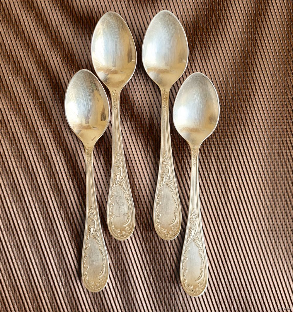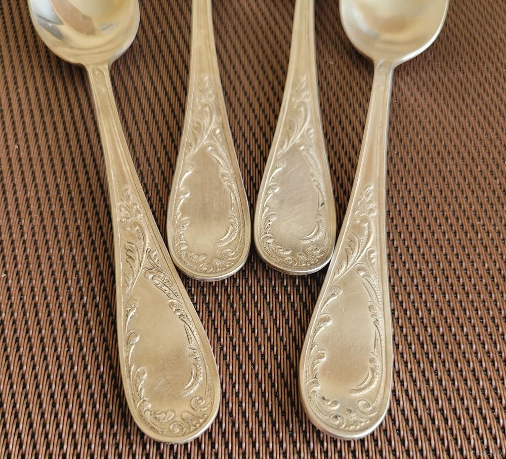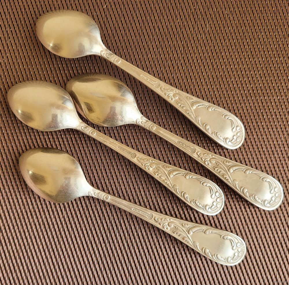 Редкие чайные ложки старое "Пламя", мельхиор, покрытие серебро, 14 см. Не использовались, состояние отражено на фото, Кольчугинский завод, клеймо Глухарь МНЦ, 1960-х годов. Красивая модель с каплевидной ручкой и выразительным рельефом, 4 шт. одним лотом.