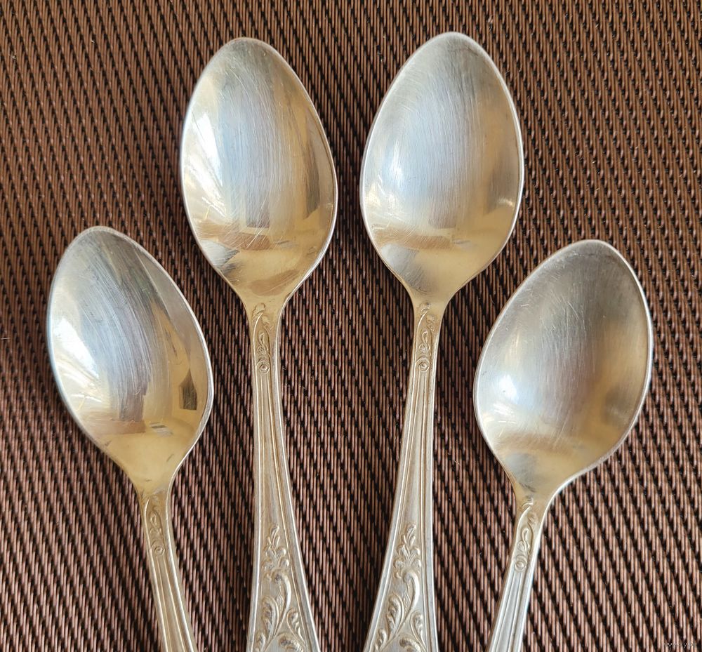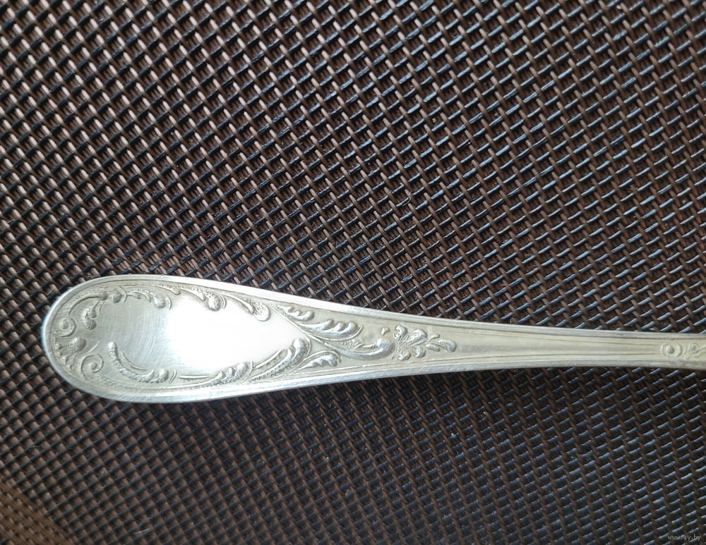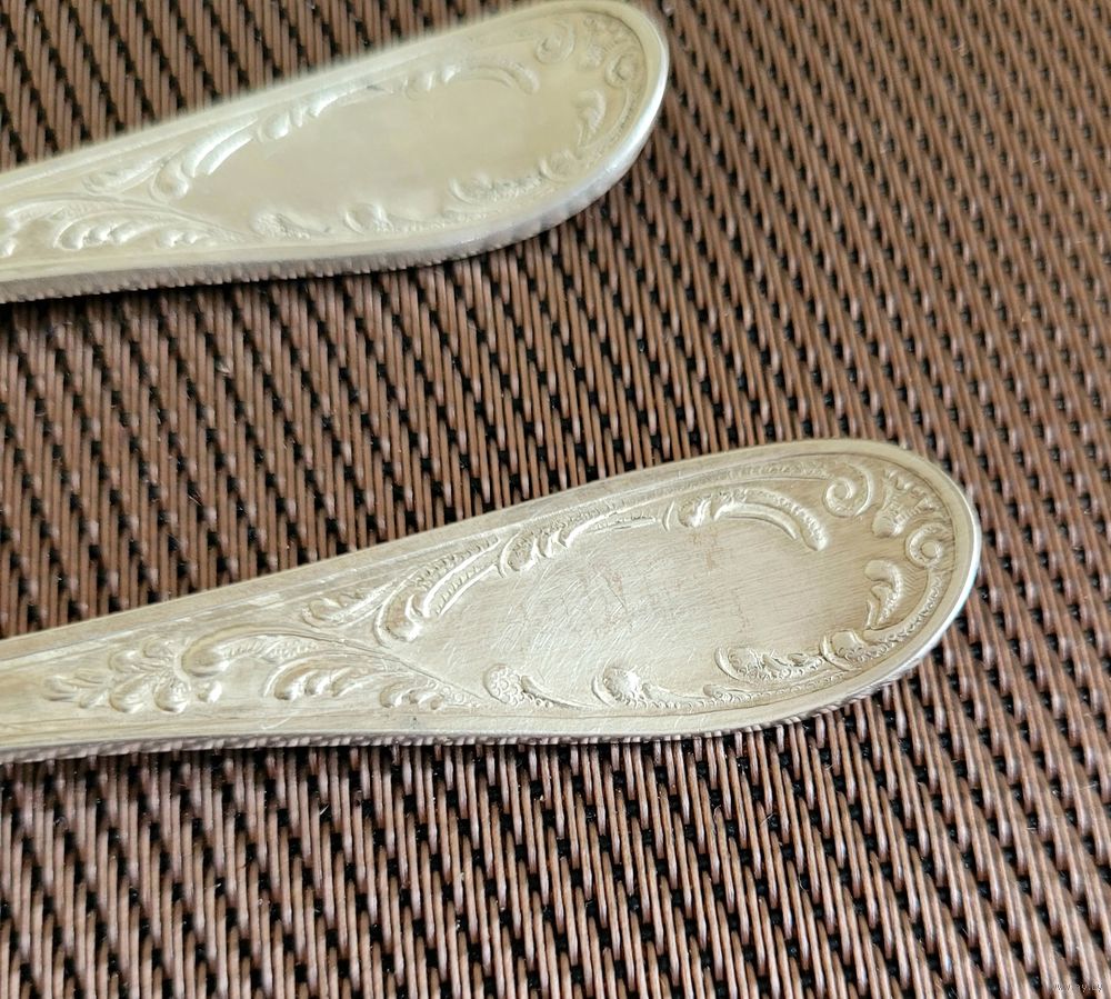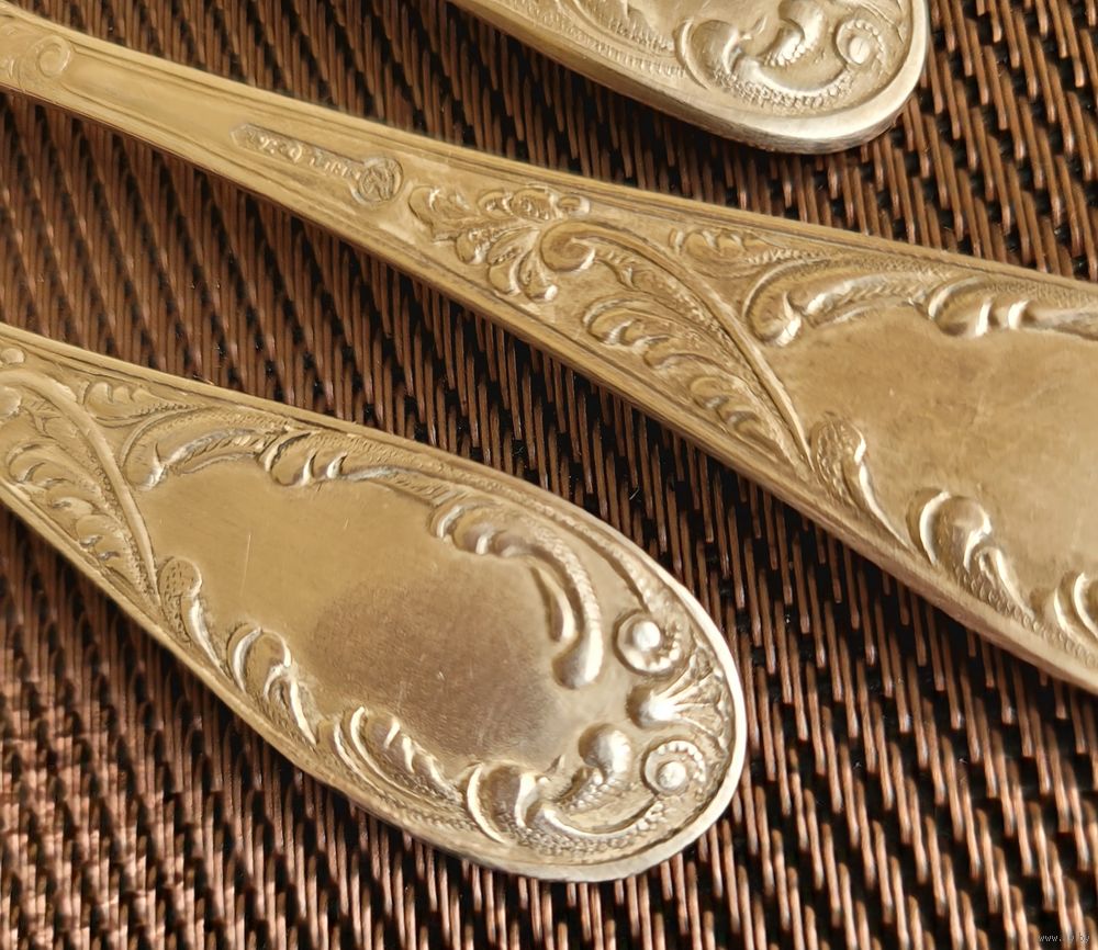 Редкие чайные ложки старое "Пламя", мельхиор, покрытие серебро, 14 см. Не использовались, состояние отражено на фото, Кольчугинский завод, клеймо Глухарь МНЦ, 1960-х годов. Красивая модель с каплевидной ручкой и выразительным рельефом, 4 шт. одним лотом.