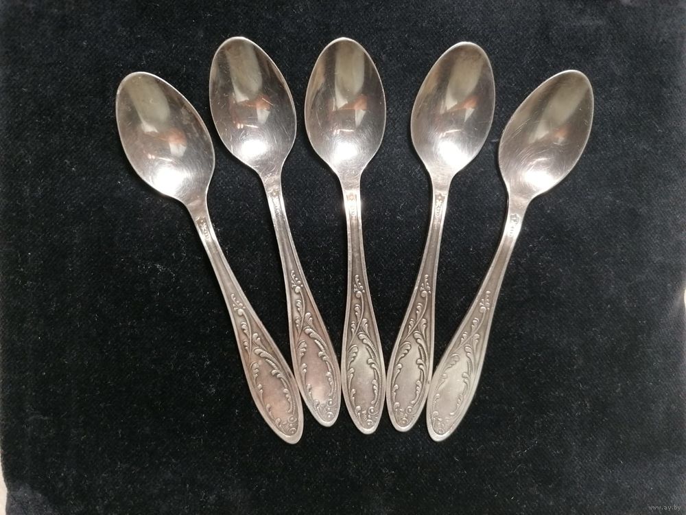 Пять кофейных ложек с характерным узором "Пламя" изготовлены из мельхиора Кольчугинским посудным заводом во времена СССР. Длина ложки 11 см. Есть клеймо на ложке.