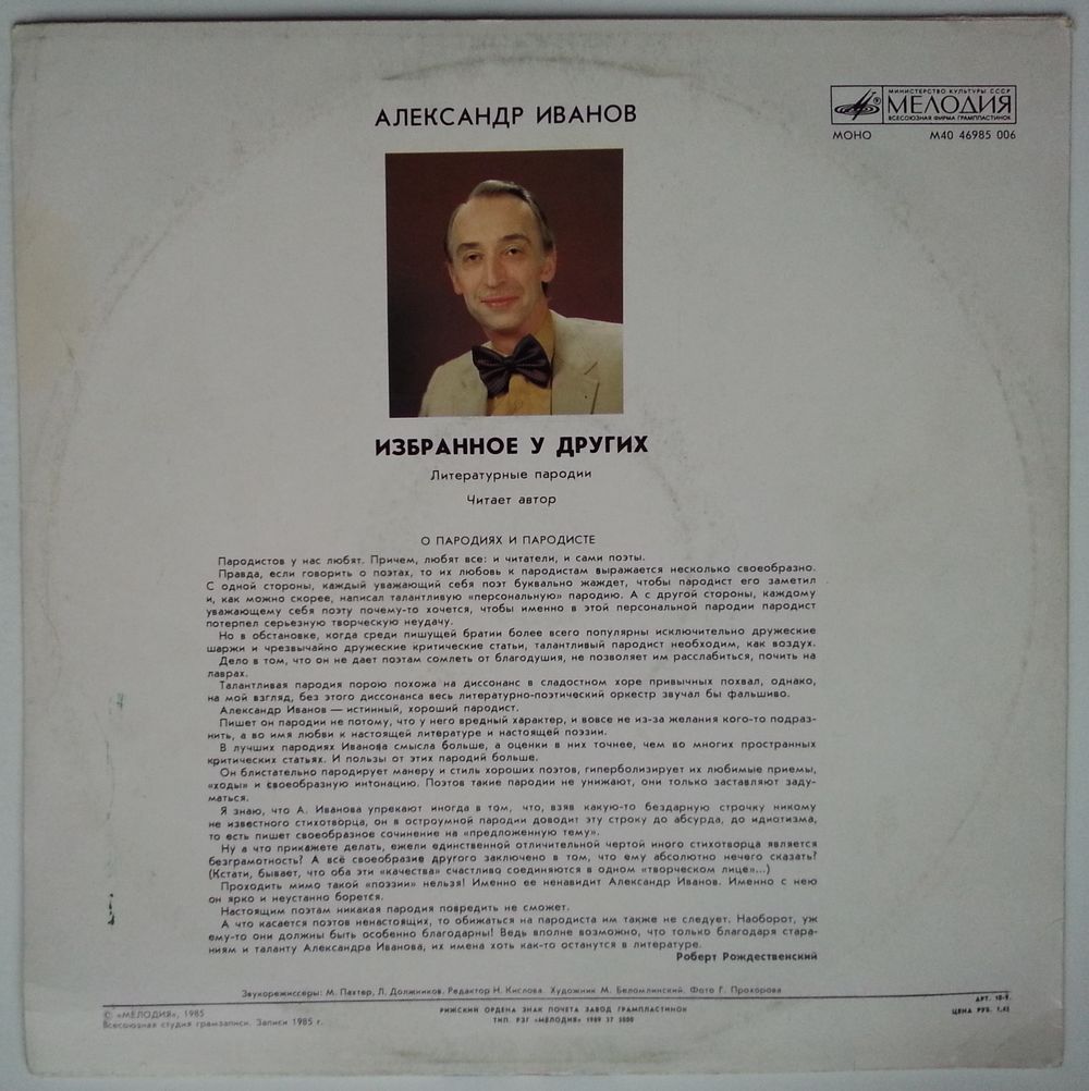 А что касается поэтов ненастоящих, то обижаться на пародиста им также не следует. Наоборот, уж ему-то они должны быть особенно благодарны! Ведь вполне возможно, что только благодаря стараниям и таланту Александра Иванова, их имена хоть как-то останутся в литературе.