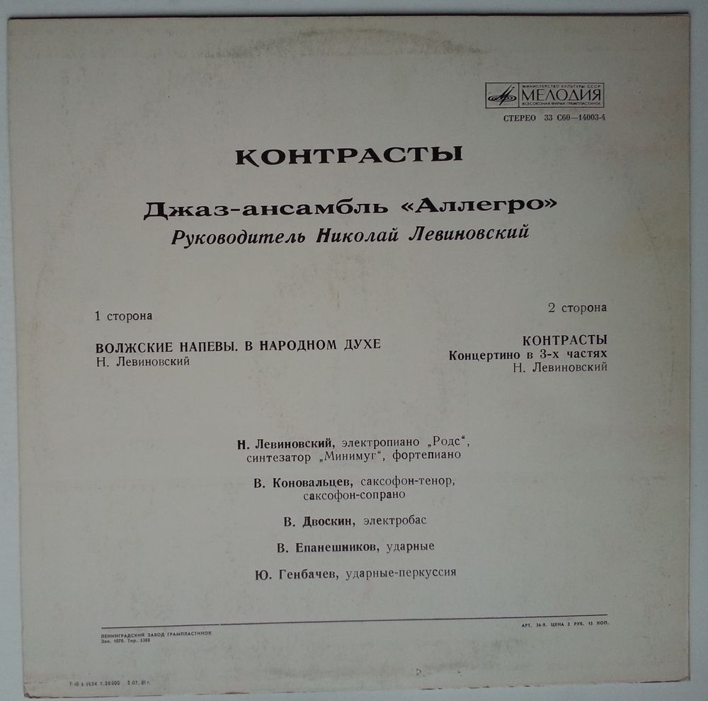 В «Аллегро» объединились пять звезд советского джаза. Николай Левиновский играет на рояле, электрическом фендер-пиано, синтезаторе. Он отличный пианист с прекрасным чувством ансамблевости. Виктор Епанешников считается одним из лучших советских джазовых барабанщиков. Прекрасным партнером ему оказался Юрий Генбачев, играющий на конгах, — он инициативен, виртуозен и подвижен. Один из красивейших голосов в ансамбле — контрабас. В руках Виктора Двоскина он то поет в балладах как виолончель, то, упруго отталкиваясь от барабанов, увлекает за собой ритм-секцию. Сегодня это один из сильнейших джазовых басистов. Владимир Коновальцев играет на саксофонах — теноре и сопрано, причем на последнем, по-жалеечному звучащем, он особенно хорош. Его соло всегда ясны по конструкции и художественной задаче, он безупречно чувствует жанр и стиль каждого эпизода.