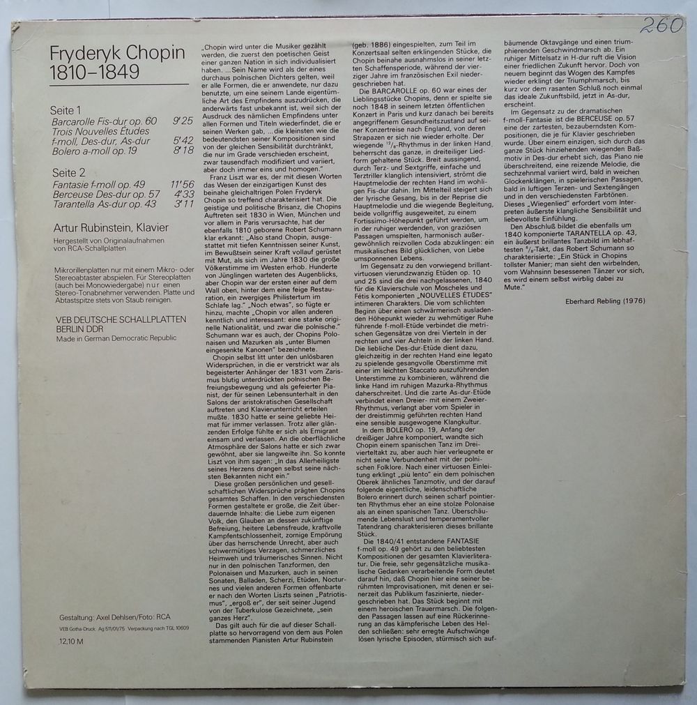 Back sleeve shows a little text about Fryderyk Chopin and the pieces on this record by Eberhard Rebling.