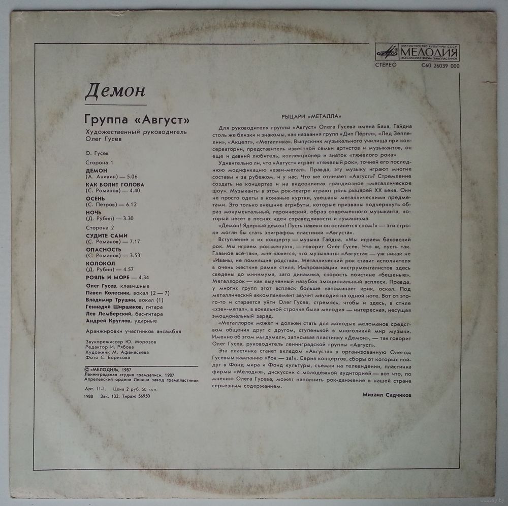 «Металлорок может и должен стать для молодых меломанов средством общения друг с другом, ступенькой в многоликий мир музыки. Именно об этом мы думали, записывая пластинку «Демон», — так говорит Олег Гусев, руководитель ленинградской группы «Август».