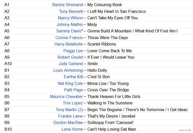 Louis Armstrong, Nat King Cole, Patti Page, Barbra Streisand, Lena Horne, Connie Francis, Peggy Lee, Judy Garland, Eartha Kitt, Nancy Wilson і іншыя