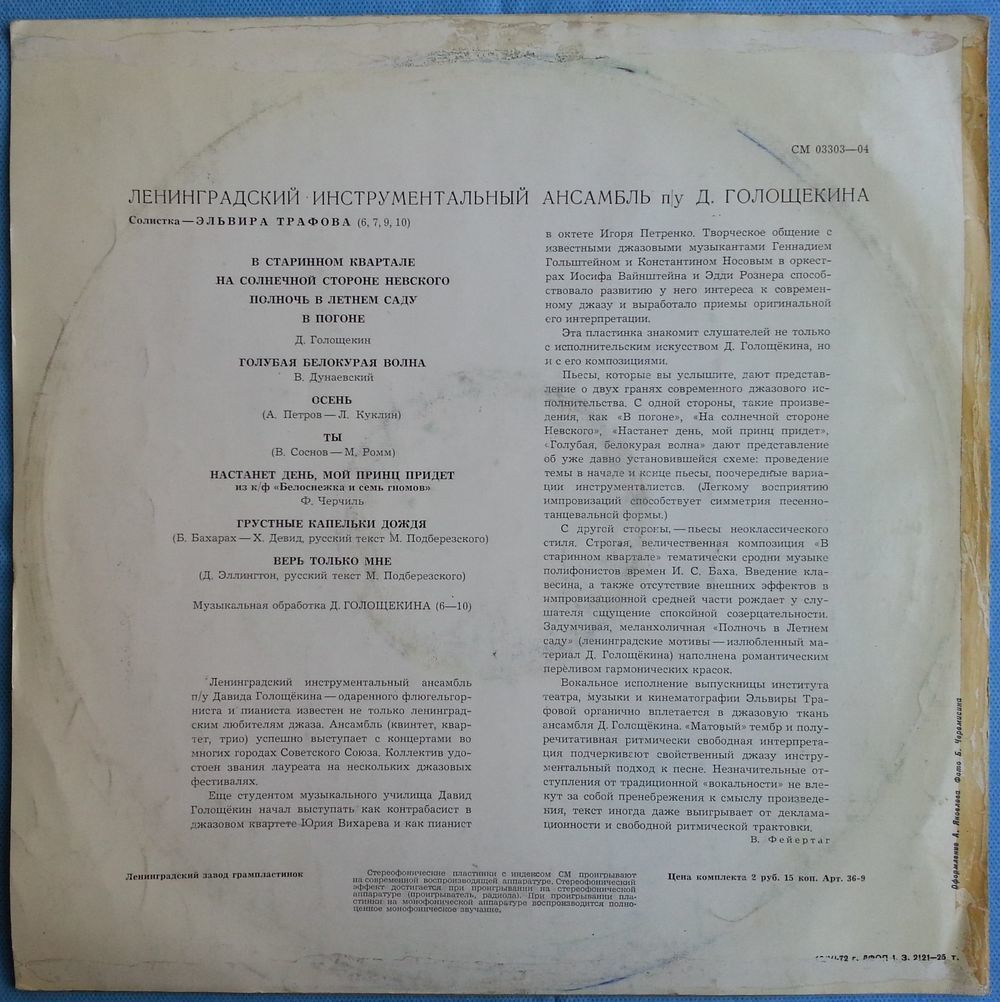 LP Давид Голощекин, Vocals – Эльвира Трафова - В Старинном Квартале (1972)