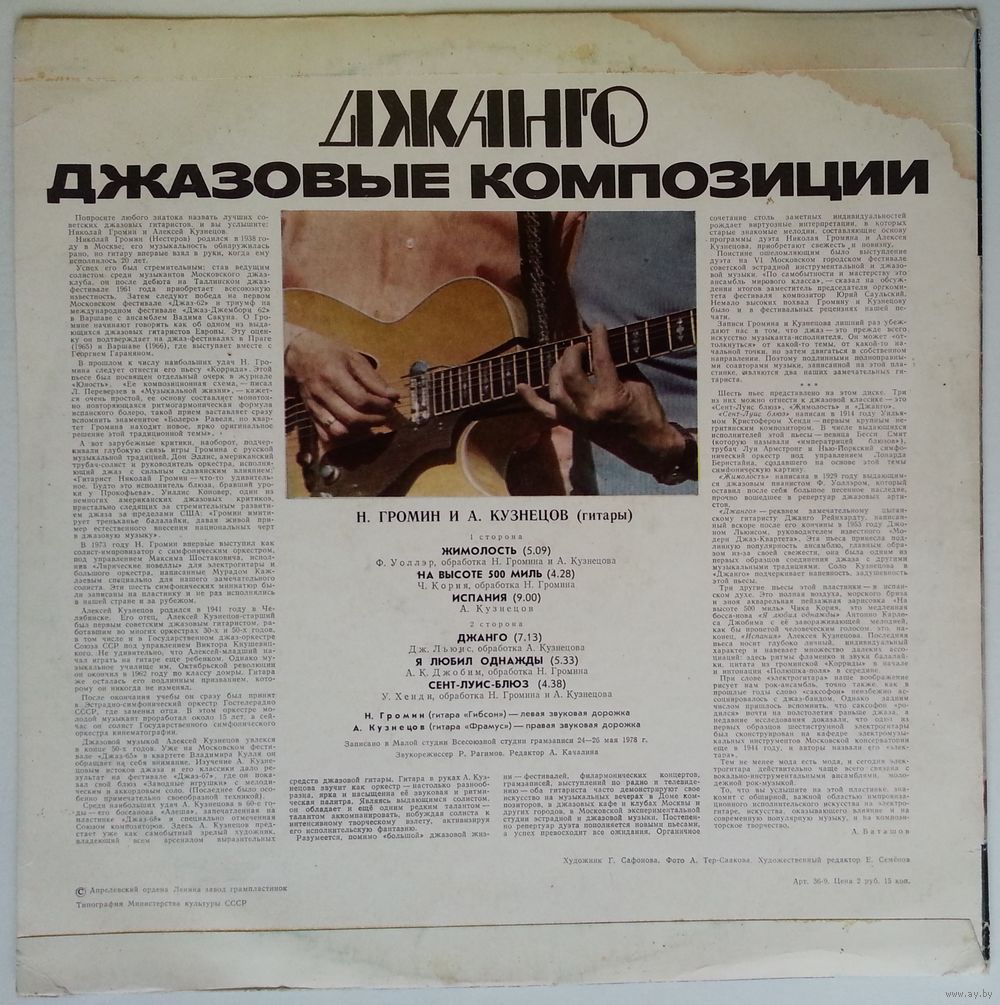Н. Громин (гитара "Гибсон") - левая звуковая дорожка, А. Кузнецов (гитара "Фрамус") - правая звуковая дорожка Записано в Малой студии Всесоюзной студии грамзаписи 24-26 мая 1978 г.