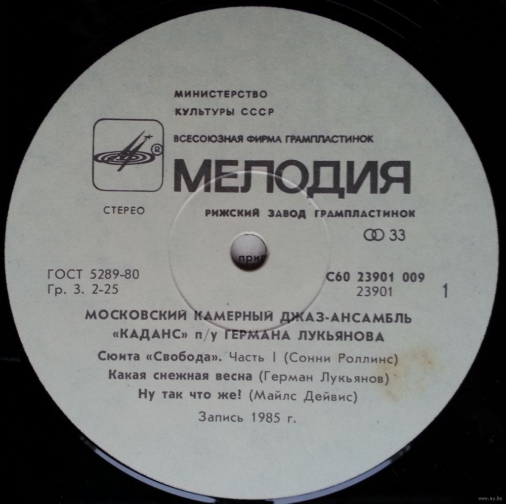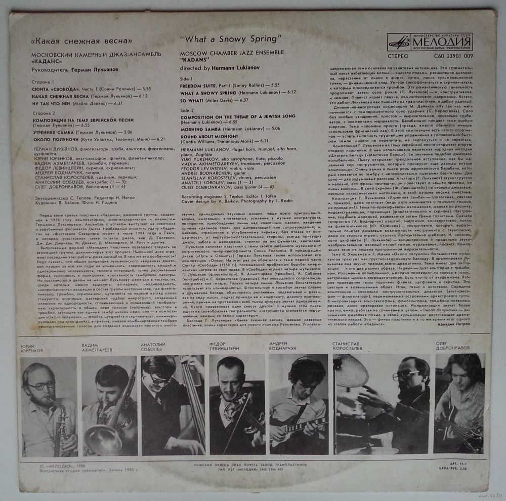 Перед вами третья пластинка "Каданса", джазовой группы, созданной в 1978 году композитором, флюгельгорнистом и пианистом Германом Лукьяновым. Ансамбль с успехом выступает на советских и зарубежных фестивалях джаза. Необходимо отметить удачу "Каданса" на "Фестивале Северного моря" в июле 1984 года в Гааге, в котором участвовали такие гиганты джаза, как Д. Гиллеспи, Дж. Дж. Джонсон, М. Дейвис, Д. Маклафлин, М. Роуч и другие.