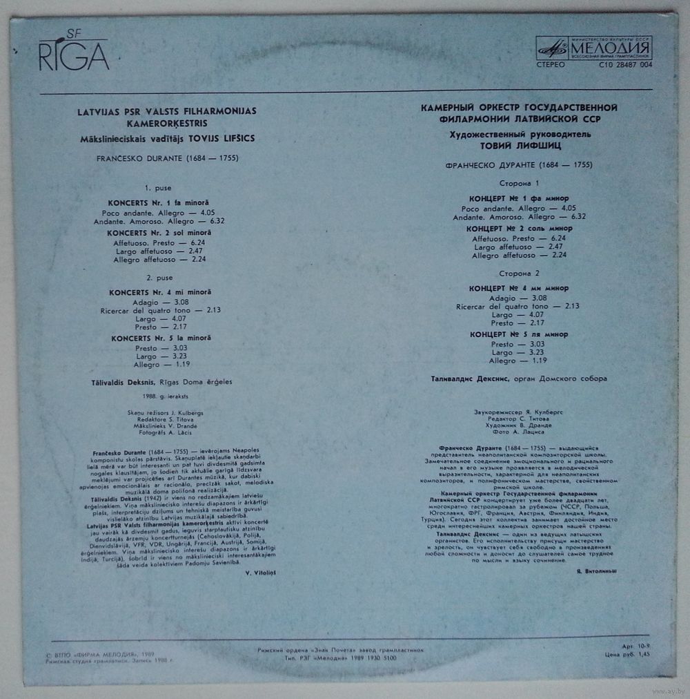 Камерный оркестр Государственной филармонии Латвийской ССР концертирует уже более двадцати лет, многократно гастролировал за рубежом (ЧССР, Польша, Югославия, ФРГ, Франция, Австрия, Финляндия, Индия, Турция). Сегодня этот коллектив занимает достойное место среди интереснейших камерных оркестров нашей страны. Таливалдис Декснис — один из ведущих латышских органистов. Его исполнительству присущи мастерство и зрелость, он чувствует себя свободно в произведениях любой сложности и доносит до слушателей самое трудное по мысли и языку сочинение.