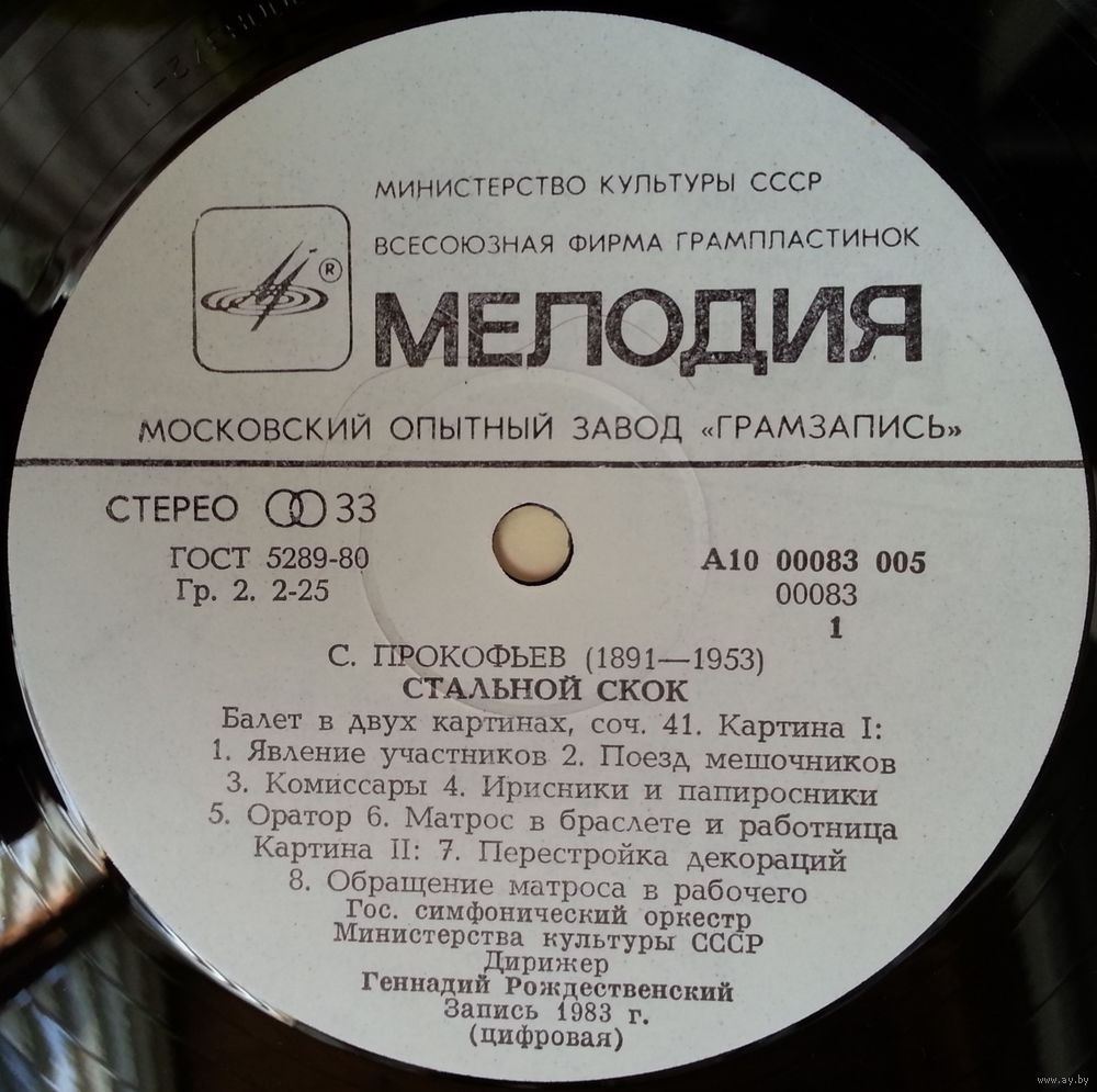 Pas d'Acier (Ballet In Two Scenes), Op. 41A1.aScene 1. 1. Participants' ParadeA1.bScene 1. 2. People With Sacks On The TrainA1.cScene 1. 3. CommissarsA1.dScene 1. 4. Toffy And Cigarette PedlarsA1.eScene 1. 5. SpeakerA1.fScene 1. 6. Sailor With A Bracelet And Woman-workerA2.aScene 2. 7. Change Of The SceneryA2.bScene 2. 8. Sailor Becomes A WorkerB1.aScene 2. 9. FactoryB1.bScene 2. 10. HammersB1.cScene 2. 11. Closing SceneB2Ode On The End Of War (For Symphony Orchestra), Op. 105Companies, etc.