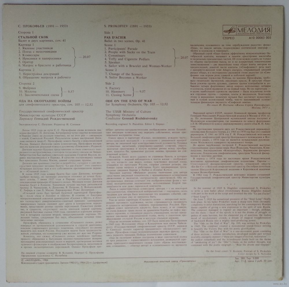 Pas d'Acier (Ballet In Two Scenes), Op. 41A1.aScene 1. 1. Participants' ParadeA1.bScene 1. 2. People With Sacks On The TrainA1.cScene 1. 3. CommissarsA1.dScene 1. 4. Toffy And Cigarette PedlarsA1.eScene 1. 5. SpeakerA1.fScene 1. 6. Sailor With A Bracelet And Woman-workerA2.aScene 2. 7. Change Of The SceneryA2.bScene 2. 8. Sailor Becomes A WorkerB1.aScene 2. 9. FactoryB1.bScene 2. 10. HammersB1.cScene 2. 11. Closing SceneB2Ode On The End Of War (For Symphony Orchestra), Op. 105Companies, etc.