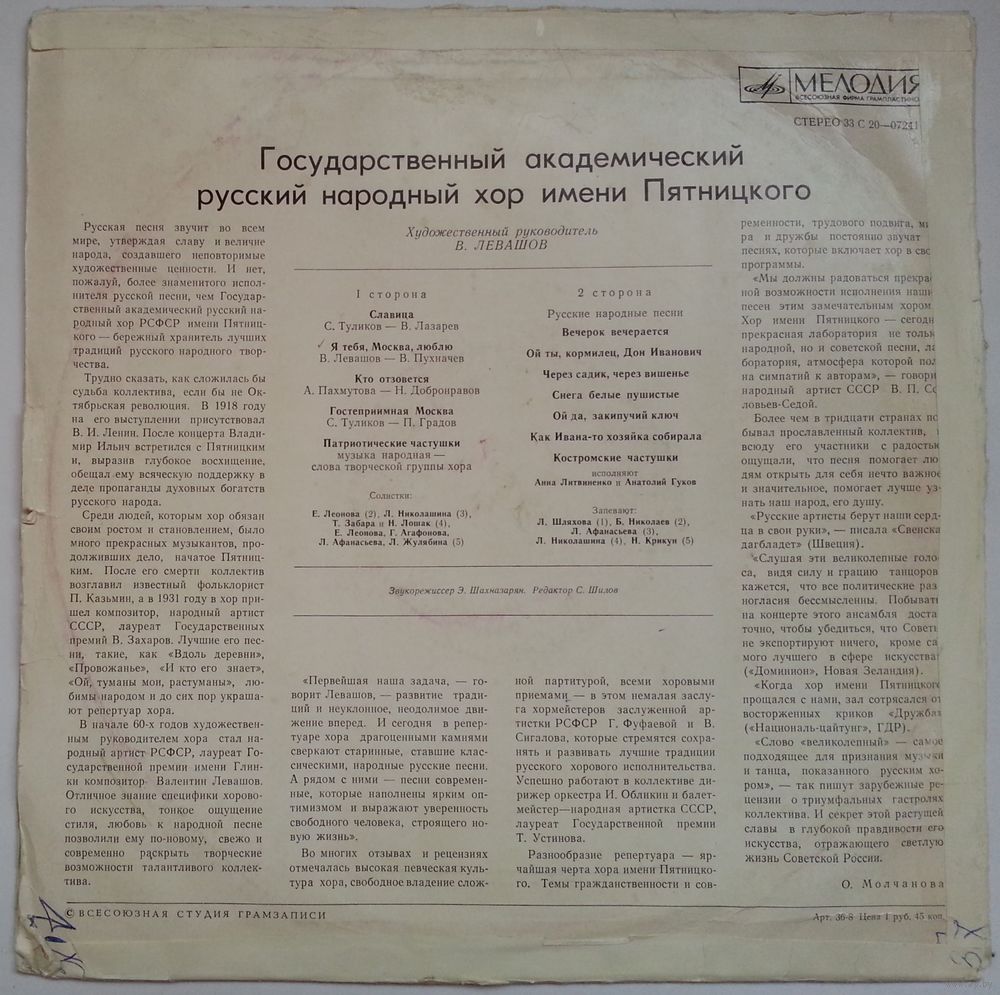 Запевы: Е.Леонова (2), Л.Николашина (3, 9), Т.Забара и Н.Лошак (4), Е.Леонова, Г.Агафонова, Л.Афанасьева и Л.Жулябина (5), Л.Шляхова (6), Б.Николаев (7), Л.Афанасьева (8), Н.Крикун (10).
