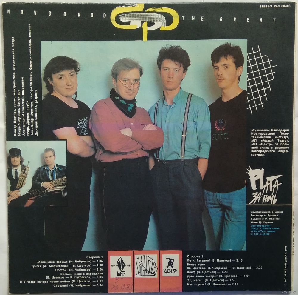 Новгородский рок. Первая виниловая пластинка новгородской группы вышла в свет в конце 1991 года. Эпоха уничтожения Родины - Советского Союза отразилась в творчестве группы и ее музыке. Надо отметить высокую профессиональность группы, впрочем, тот факт, что альбом был выпущен фирмой грамзаписи, говорит сам за себя.