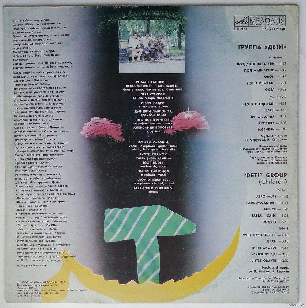 Когда контуры песни проясняются, включается пульт и восьмиканальный магнитофон «Plotnicow». Пошла работа на запись, сопровождаемая беготней на кухню за чаем и на улицу за «Космосом» и «Беломором». Самые умные — это Рома с Петей, они очень долго спорят со ссылками на классиков, после, прижав уши, записывают основные функциональные партии. На каком-то этапе к дуэту присоединяется Игорь со своим японским клавикордом. Следом за ним Леня с Димой — духовая секция — и Саша, настоящий живой ударник! Как правило, аранжировка каждой песни осуществляется по принципу радуги, где ни один цвет не повторяется дважды и «тянется» от недели до года. Скорее всего эта кристаллизация и есть своеобразный поиск «философского камня», применимый к условиям жизни, близким рок-н-роллу. Рекомендуемая вам пластинка включает в себя своеобразный „Greatest Hits" группы «Дети». В нее входят переписанные заново и с лучшим качеством боевики из их первого полудомашнего альбома «Кесарево сечение» (1987 г.): «Все, я сказал!», «Пол Маккартни» и фолк-рок-небылица «Воздухоплаватели». В числе относительно новых — специально подобранные по звуку и слову «Три аккорда», «Могилки», «Окоп», «Русалка», «BACH», «Кто это сделал?» и «Осел». Часть их, несомненно, интересна как новый качественный виток отечественной поп-музыки, а, например, «Могилки» и «Русалка» по своей сути оригинально воссоздают дух и стержень русского лирического эпоса в лучших традициях А. К. Толстого и В. А. Жуковского.