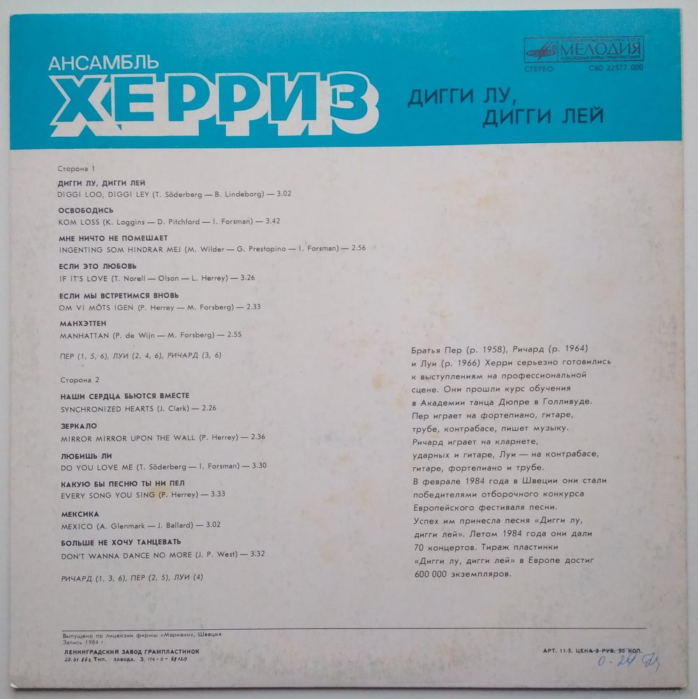 Изготовлено по лицензии фирмы "Марианн", Швеция. Запись 1984 года.