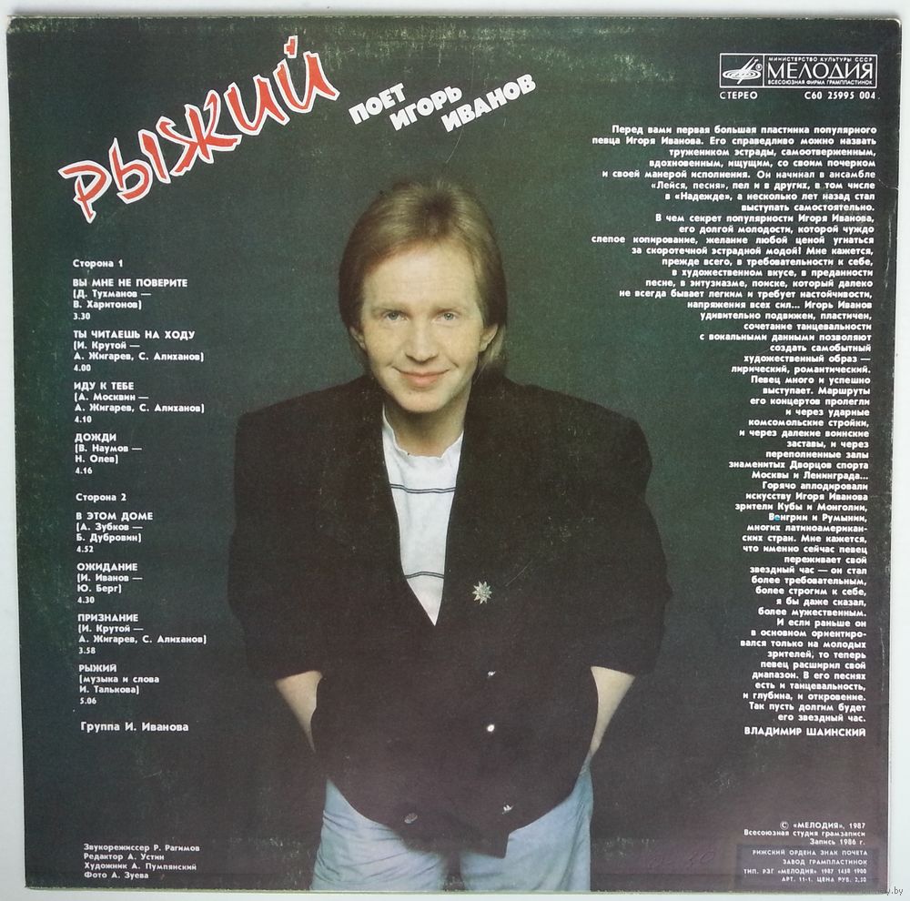 еред вами первая большая пластинка популярного певца Игоря Иванова. Его справедливо можно назвать тружеником эстрады, самоотверженным, вдохновенным, ищущим, со своим почерком и своей манерой исполнения. Он начинал в ансамбле «Лейся, песня», пел и в других, в том числе в «Надежде», а несколько лет назад стал выступать самостоятельно.