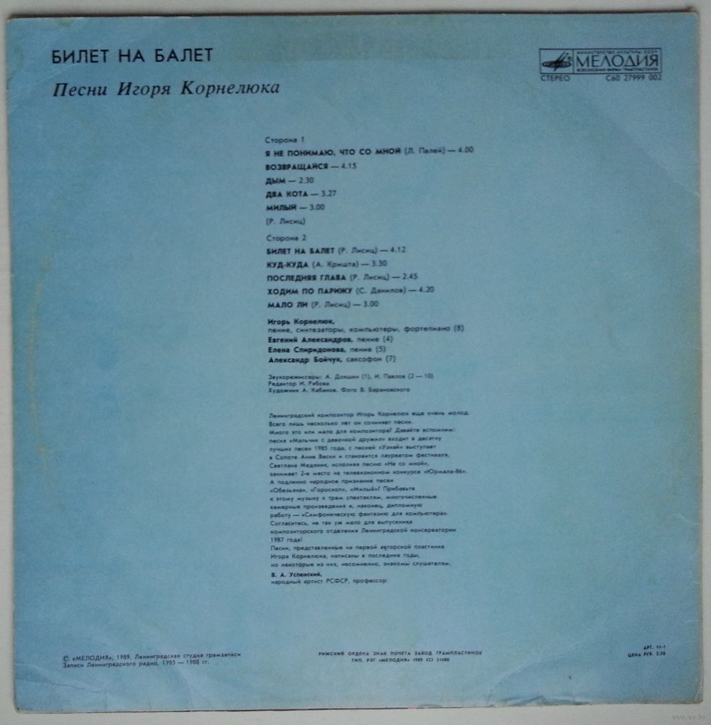 Ленинградский композитор Игорь Корнелюк еще очень молод. Всего лишь несколько лет он сочиняет песни. Много это или мало для композитора? Давайте вспомним: песня "Мальчик с девочкой дружил" входит в десятку лучших песен 1985 года, с песней "Узнай" выступает в Сопоте Анне Вески и становится лауреатом фестиваля, Светлана Медяник, исполняя песню "Не со мной", занимает 2-е место на телевизионном конкурсе "Юрмала-86". А подлинно народное признание песен "Обезьяна", "Гороскоп", "Милый"? Прибавьте к этому музыку к трем спектаклям, многочисленные камерные произведения и, наконец, дипломную работу - "Симфоническую фантазию для компьютера". Согласитесь, не так уж и мало для выпускника композиторского отделения Ленинградской консерватории 1987 года?