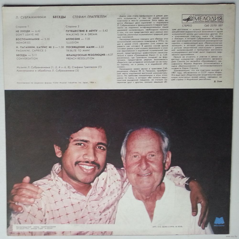 Музыка Л. Субраманиама (1, 2, 4-6, 8), С. Граппелли (7), аранжировка и обработка Л.Субраманиама (3), Л. Субраманиам - скрипка (1, 8), Стефан Граппели - скрипка (1, 6), Джо Сэмпл (орган), Фрэнк Морган (саксофон), Хорхе Струне (гитара). По лицензии Victor Musical Industries Inc (Япония)