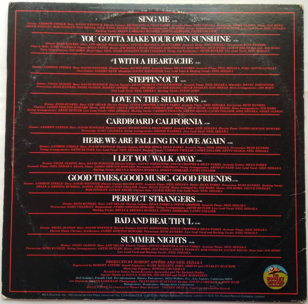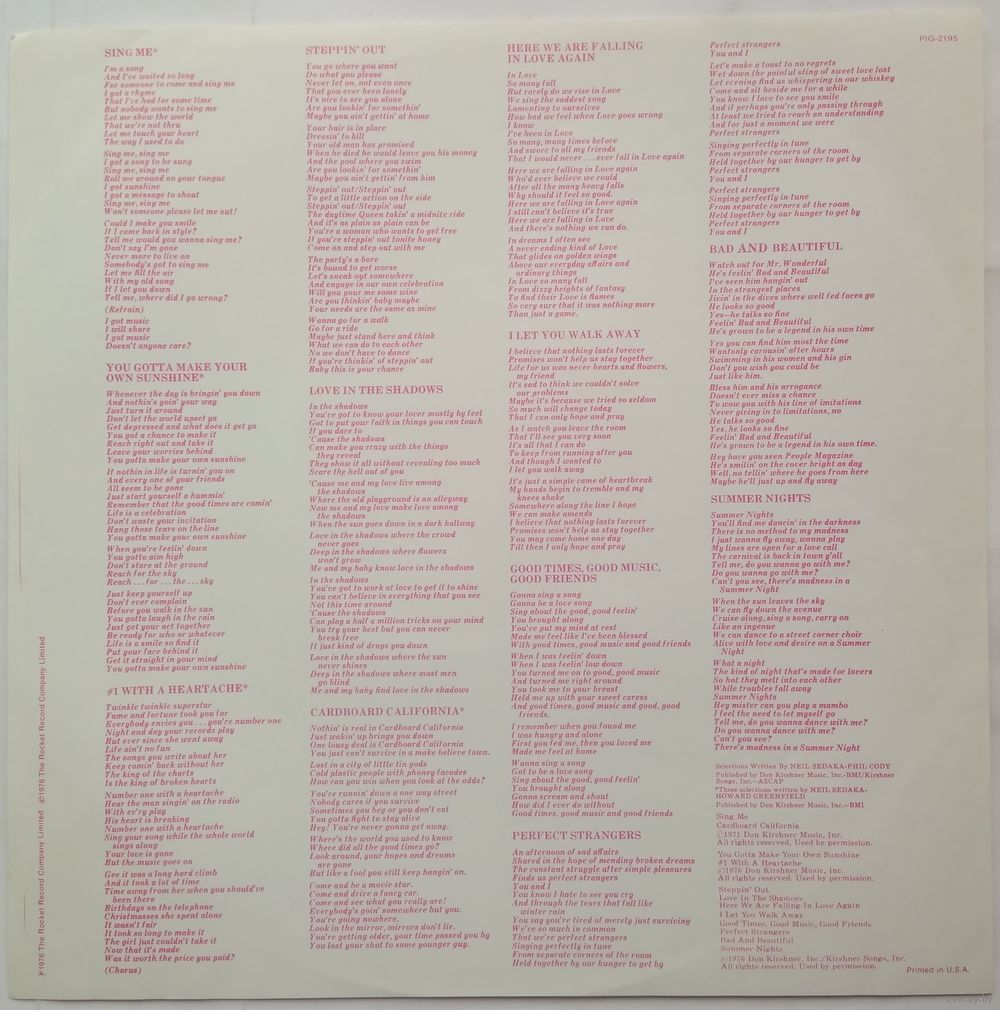 Written-By - Howard Greenfield (tracks: A1 to A3, A6), Neil Sedaka, Phil Cody (tracks: A4, A5, B1 to B6)