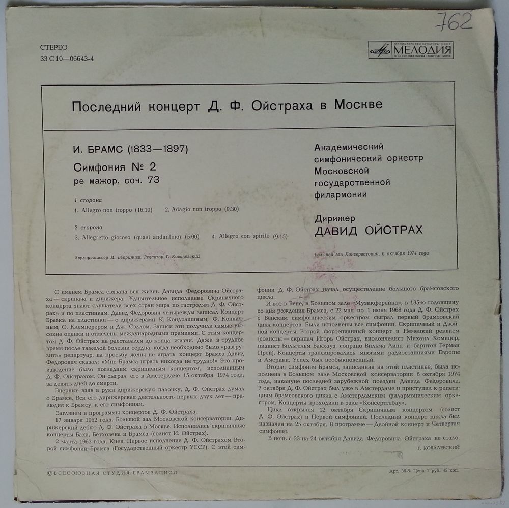 Акад. симф. орк. Моск. гос. филармонии, дир. Д. Ойстрах.