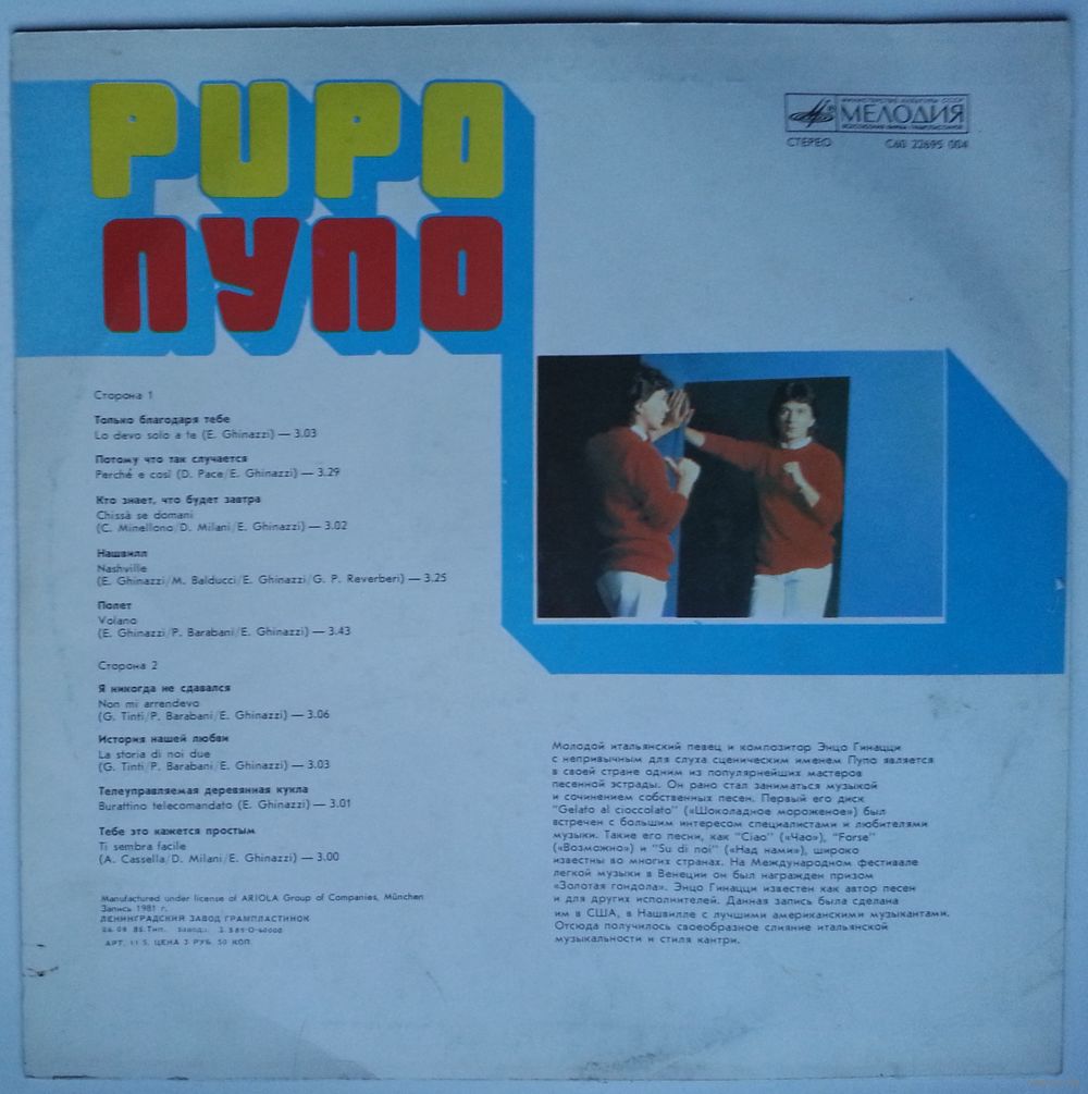 Молодой итальянский певец и композитор Энцо Гинацци с непривычным для слуха сценическим именем Пупо является в своей стране одним из популярнейших мастеров песенной эстрады. Он рано стал заниматься музыкой и сочинением собственных песен. Первый его диск "Gelato al cioccolato" («Шоколадное мороженое») был встречен с большим интересом специалистами и любителями музыки. Такие его песни, как "Ciao" («Чао»), "Forse" («Возможно») и "Su di noi" («Над нами»), широко известны во многих странах. На Международном фестивале легкой музыки в Венеции он был награжден призом Золотая гондола». Энцо Гинацци известен как автор песен и для других исполнителей. Данная запись была сделана им в США, в Нашвилле с лучшими американскими музыкантами. Отсюда получилось своеобразное слияние итальянской музыкальности и стиля кантри.
