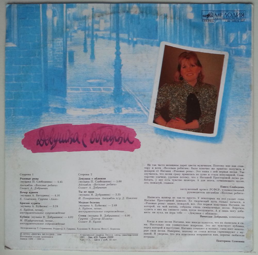 Написать шлягер не так-то просто. У некоторых на это уходят годы. Наталье Просторовой повезло. Ее творческий путь только начался, а «Розовые розы» знают, пожалуй, все. Это первая пластинка Наташи, на которой, на мой взгляд, собраны очень симпатичные песни. Впрочем, судить о них вы сможете сами, когда послушаете. А я лишь могу добавить: ни пуха, ни пера тебе — «Девушка с обложки».