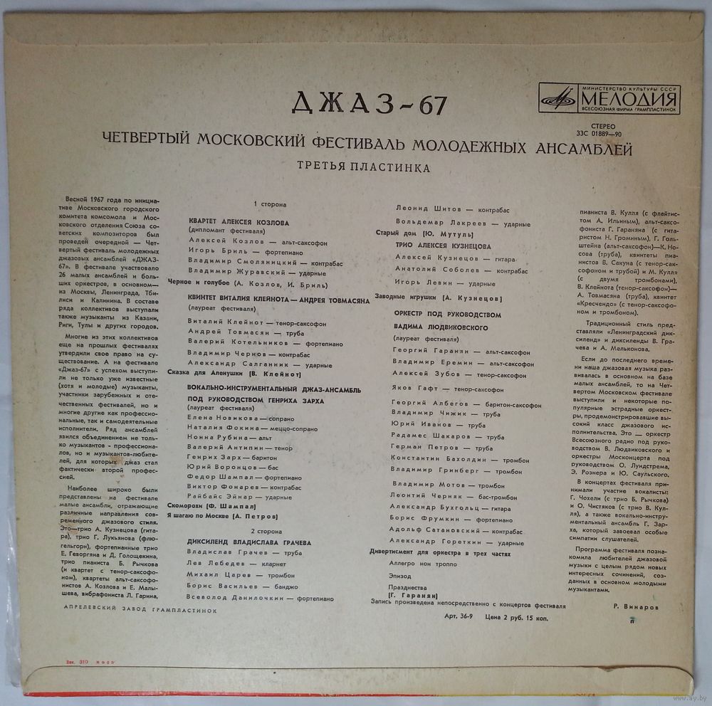 Longer title is on back sleeve: Джаз 67. Четвертый Московский Фестиваль Молодежных Ансамблей. Третья Пластинка.