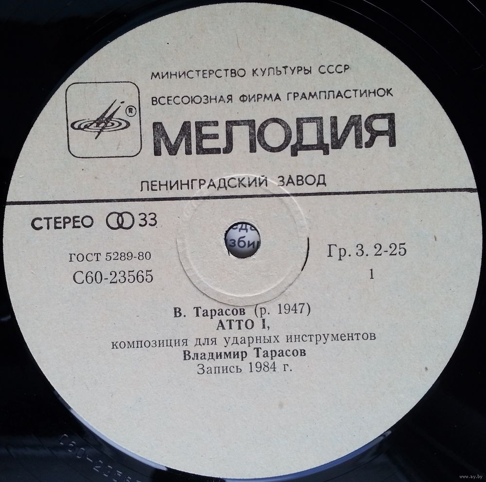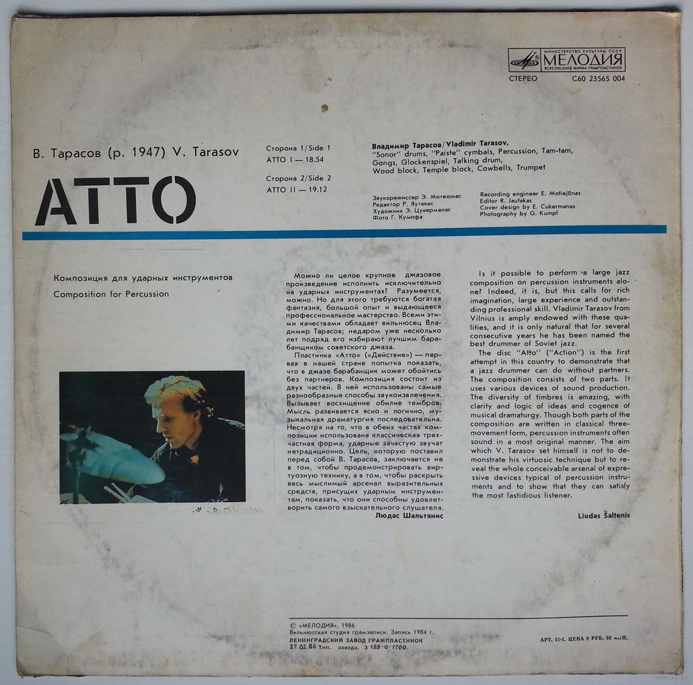 Пластинка «Атто» («Действие») — первая в нашей стране попытка показать, что в джазе барабанщик может обойтись без партнеров. Композиция состоит из двух частей. В ней использованы самые разнообразные способы звукоизвлечения. Вызывает восхищение обилие тембров. Мысль развивается ясно и логично, музыкальная драматургия последовательна. Несмотря на то, что в обеих частях композиции использована классическая трехчастная форма, ударные зачастую звучат нетрадиционно. Цель, которую поставил перед собой В. Тарасов, заключается не в том, чтобы продемонстрировать виртуозную технику, а в том, чтобы раскрыть весь мыслимый арсенал выразительных средств, присущих ударным инструментам, показать, что они способны удовлетворить самого взыскательного слушателя.