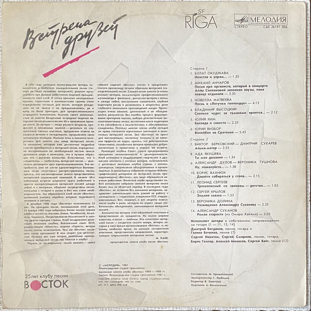 Примечание: Встреча Друзей. 25 лет клубу песни ``Восток``.` СССР МЕЛОДИЯ. Ленинградский завод грампластинок. 1987г. 45об. Конверт: Цветной иллюстрированный, Оригинальный. 300мм. СТЕРЕО С60-26191-006