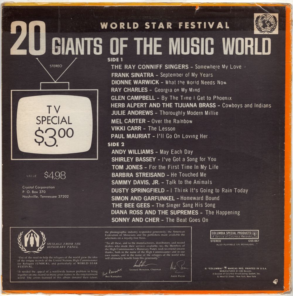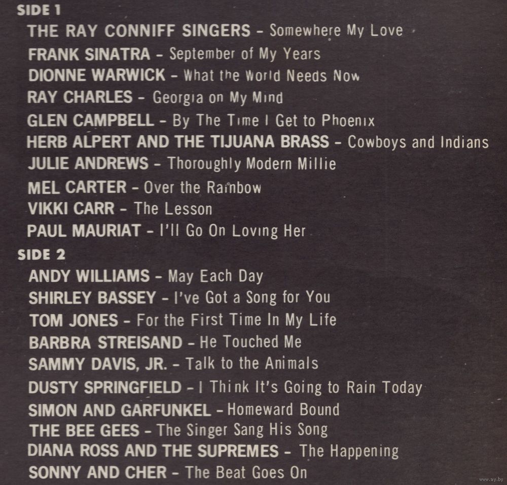 Frank Sinatra, Ray Charles, Simon and Garfunkel, The Bee Gees, Dusty Springfield, Diana Ross, Dionne Warwick, Paul Mauriat, Ray Conniff, Andy Williams, Shirley Bassey, Tom Jones, Barbra Streisand, Sonny & Cher і іншыя