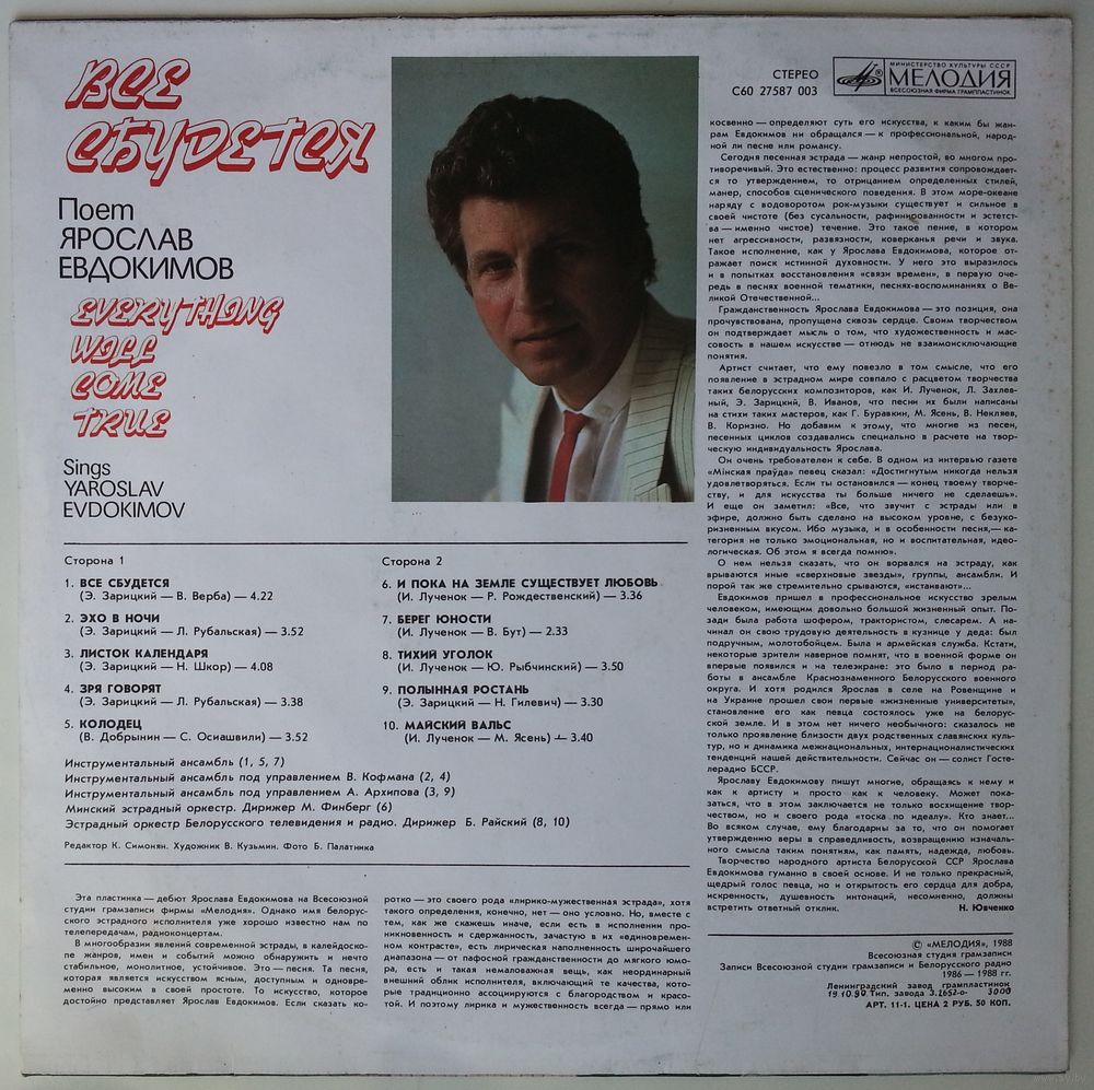 Эта пластинка — дебют Ярослава Евдокимова на Всесоюзной студии грамзаписи фирмы «Мелодия». Однако имя белорусского эстрадного исполнителя уже хорошо известно нам по телепередачам, радиоконцертам.