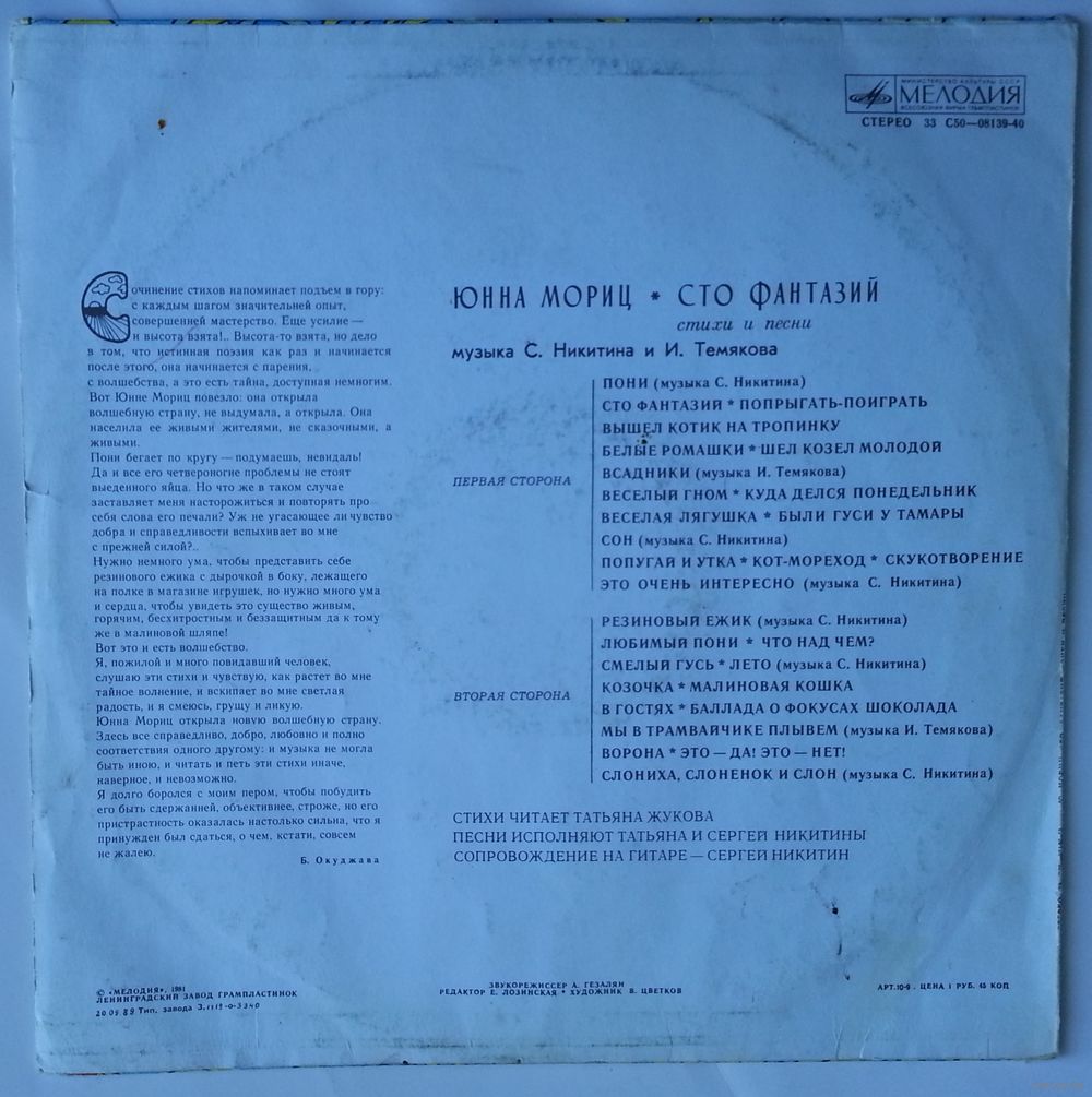 Музыка С. Никитина и И. Темякова. Стихи читает Татьяна Жукова. Песни исполняют Татьяна и Сергей Никитины. Сопровождение на гитаре – Сергей Никитин.