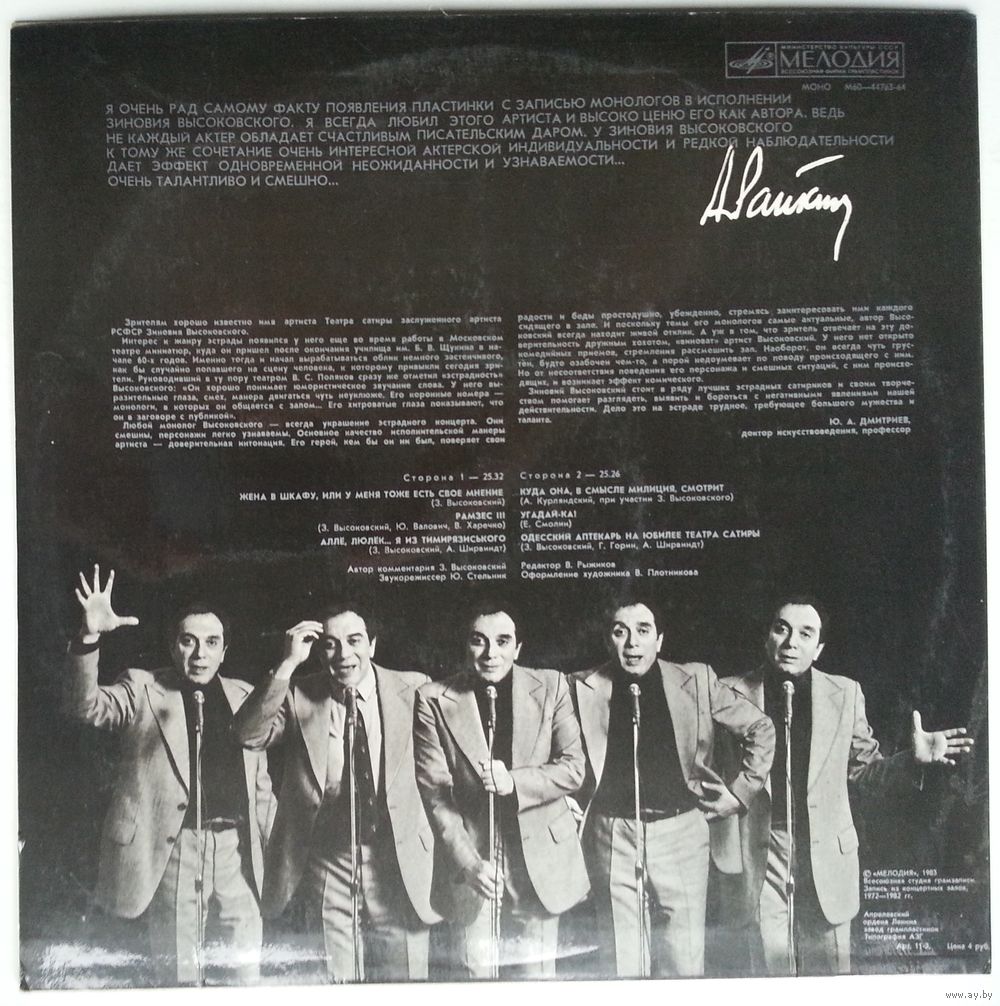 Я очень рад самому факту появления пластинки с записью монологов в исполнении Зиновия Высоковского. Я всегда любил этого артиста и высоко ценю его как автора. Ведь не каждый актер обладает счастливым писательским даром. У Зиновия Высоковского к тому же сочетание очень интересной актерской индивидуальности и редкой наблюдательности дает эффект одновременной неожиданности и узнаваемости…