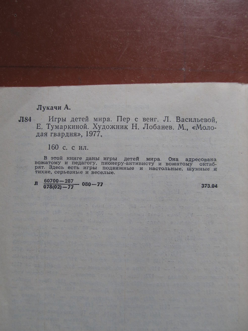 Эта книга дает описание игр, пользующихся популярностью у различных народов. В книгу вошли игры, в которые можно играть на свежем воздухе, групповые игры, требующие от игроков быстроты, физической силы, ловкости, игры для двоих или для одного, несколько игр с песнями и танцами. Там, где возможно, описание игр дополнено данными, относящимися к происхождению, истории игры.