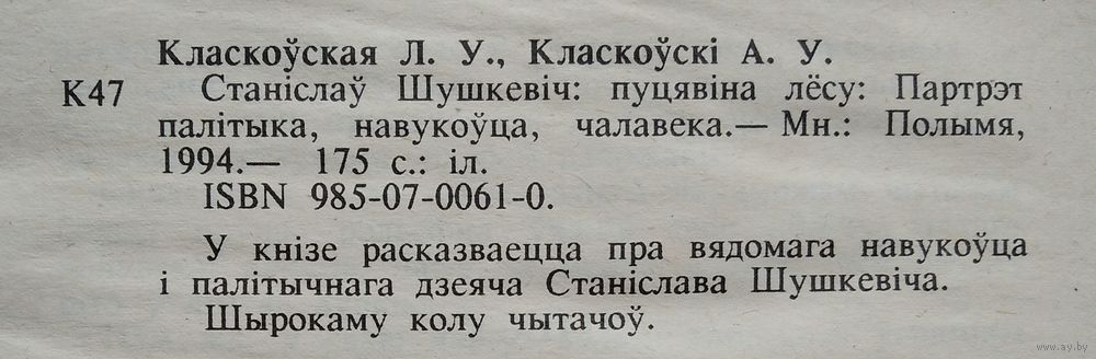 Людміла Класкоўская, Аляксандр Класкоўскі. Станіслаў Шушкевіч: пуцявіна лёсу: партрэт палітыка, навукоўца, чалавека. Мінск : Полымя, 1994 г. 173 с. Мяккая вокладка.