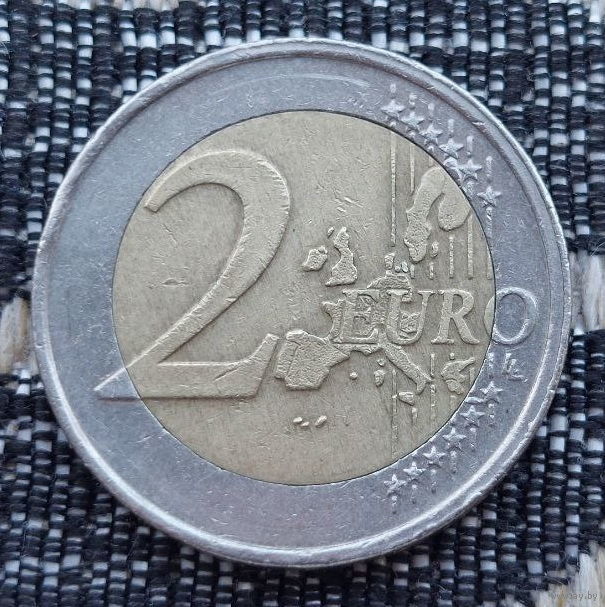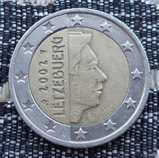 Люксембург 2 евро 2002 года. Король. Клеймо Гастауер-Клер Иветта. Лук со стрелой и звёздочкой и Посох Меркурия.