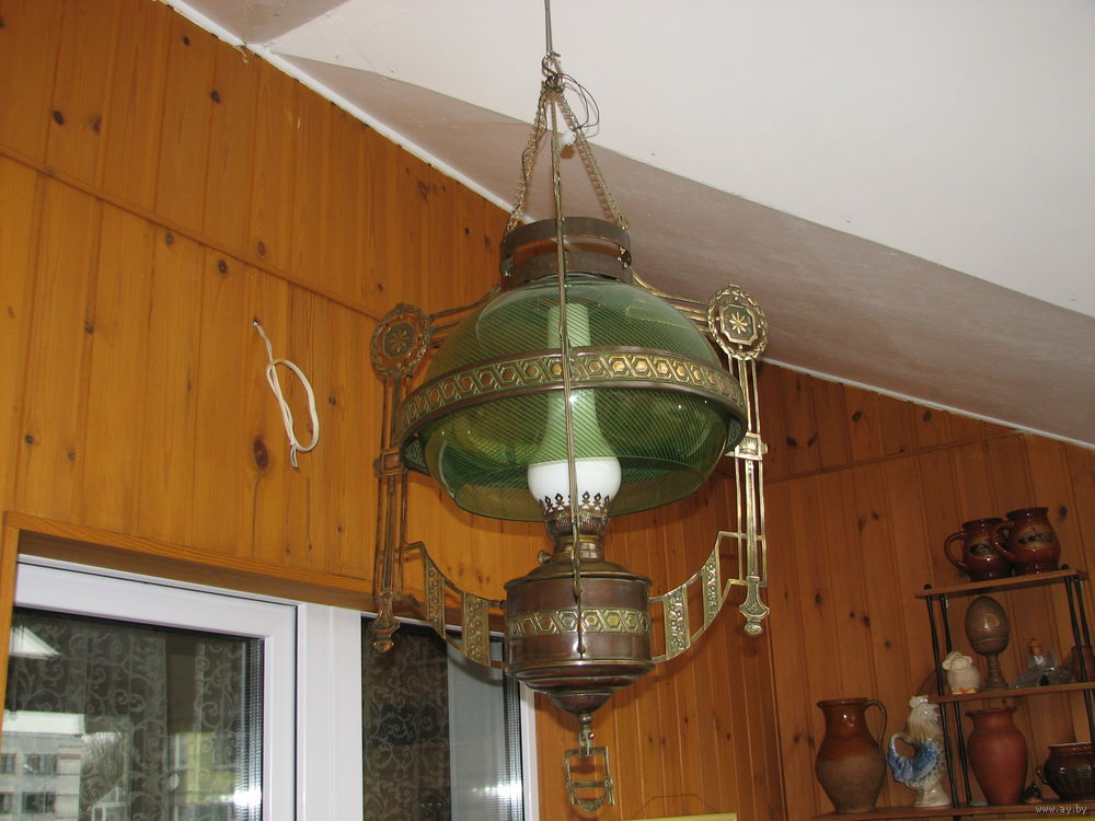 Антикварная керосиновая бронзовая лампа на цепях . Переделана под электро . Высота с цепями 90 см. Плафон ГДРовский (пластик ).