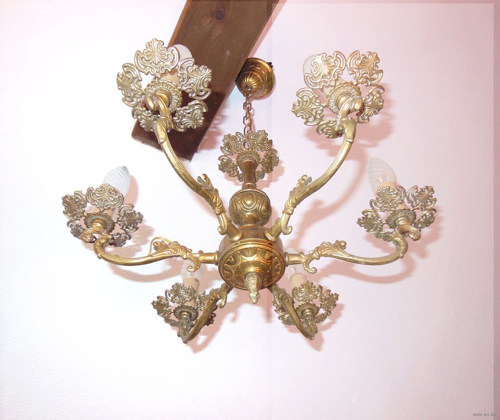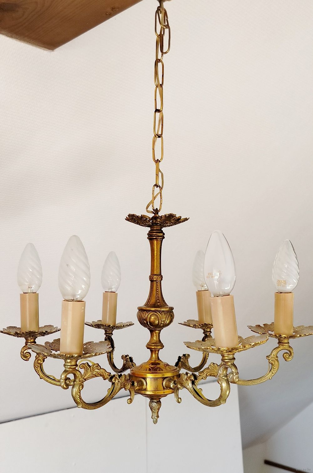 Винтажная французская люстра на 6 лампочек. Бронза. Середина 20 века. Цоколь Е14. Диаметр 37 см, высота 30 см ( с цепью 75 см). Состояние очень хорошее. По запросу отправлю видео.