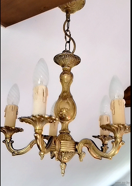 Винтажная французская люстра на 5 лампочек с деталями в виде листьев аканта. Бронза (клеймо). Середина 20в. Цоколь Е14. Диаметр 30 см, высота 35 (с цепью 58 см). Дополнительно, по запросу отправлю видео. Телефон указан в контактных данных продавца