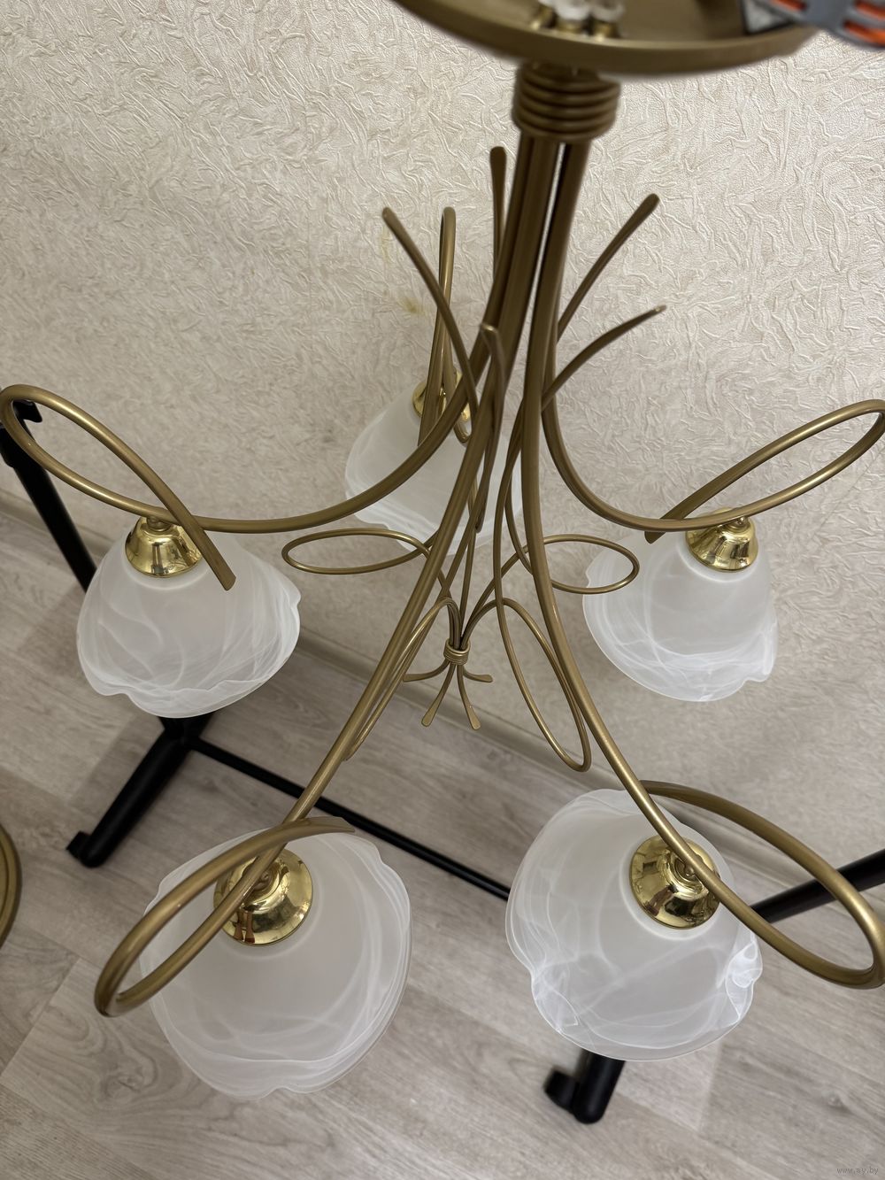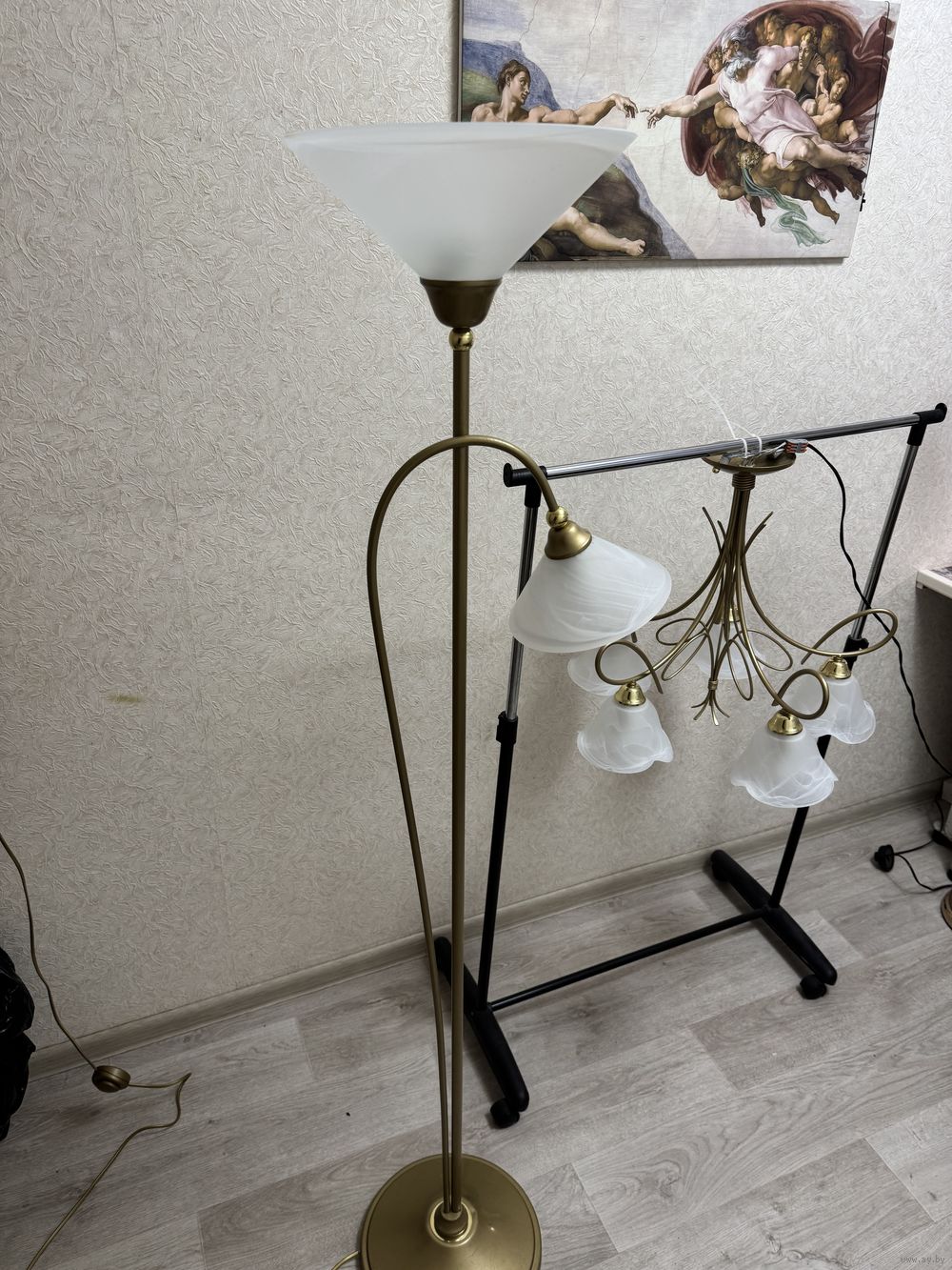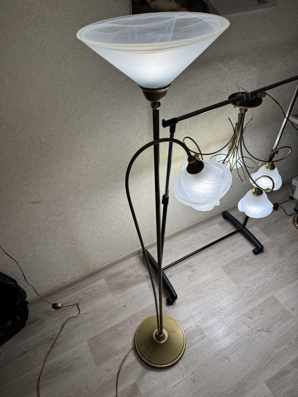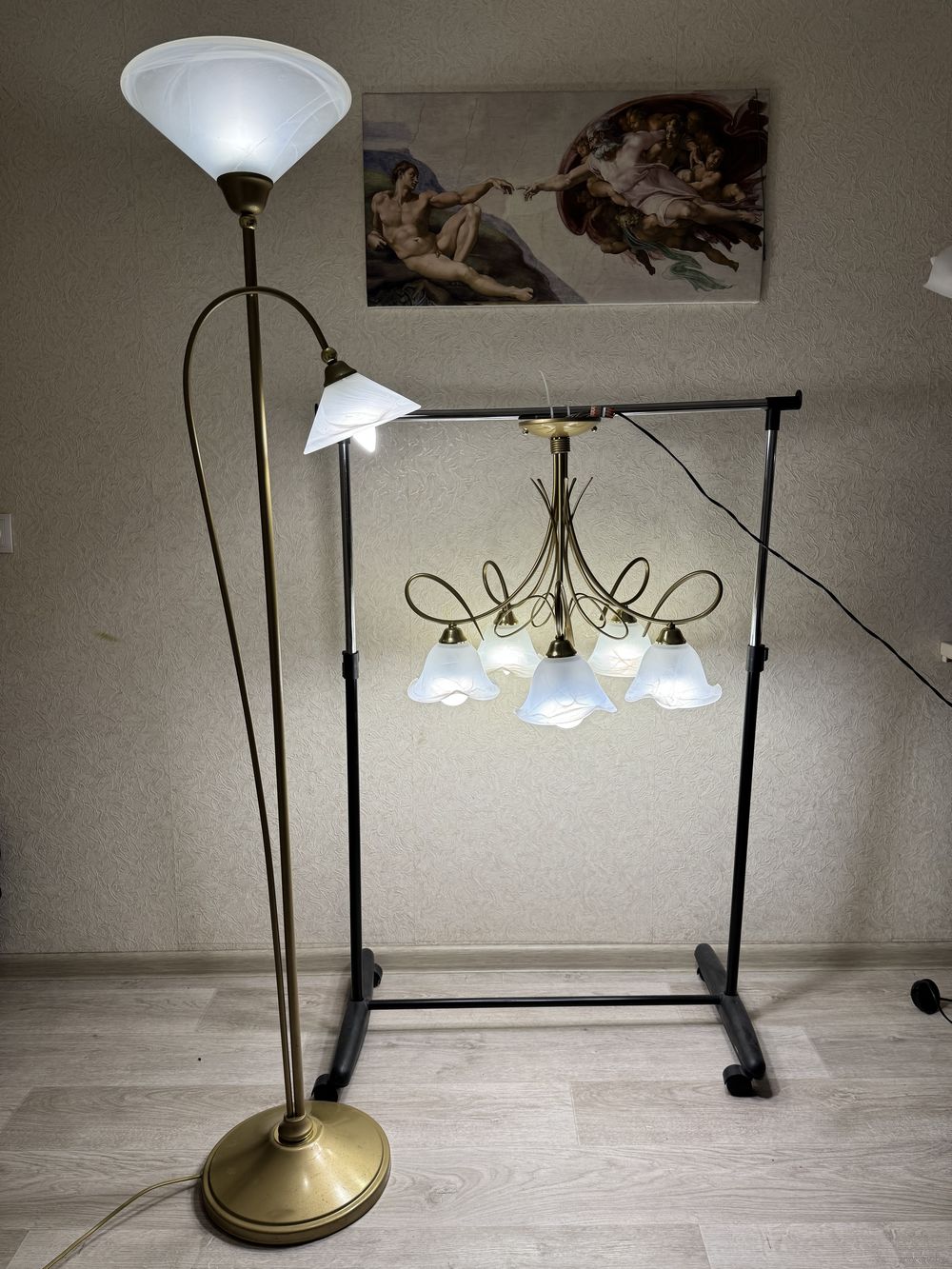 Продаётся комплект: б/у люстра и напольный торшер. Цвет золотистый, лампочки идут в комплекте.