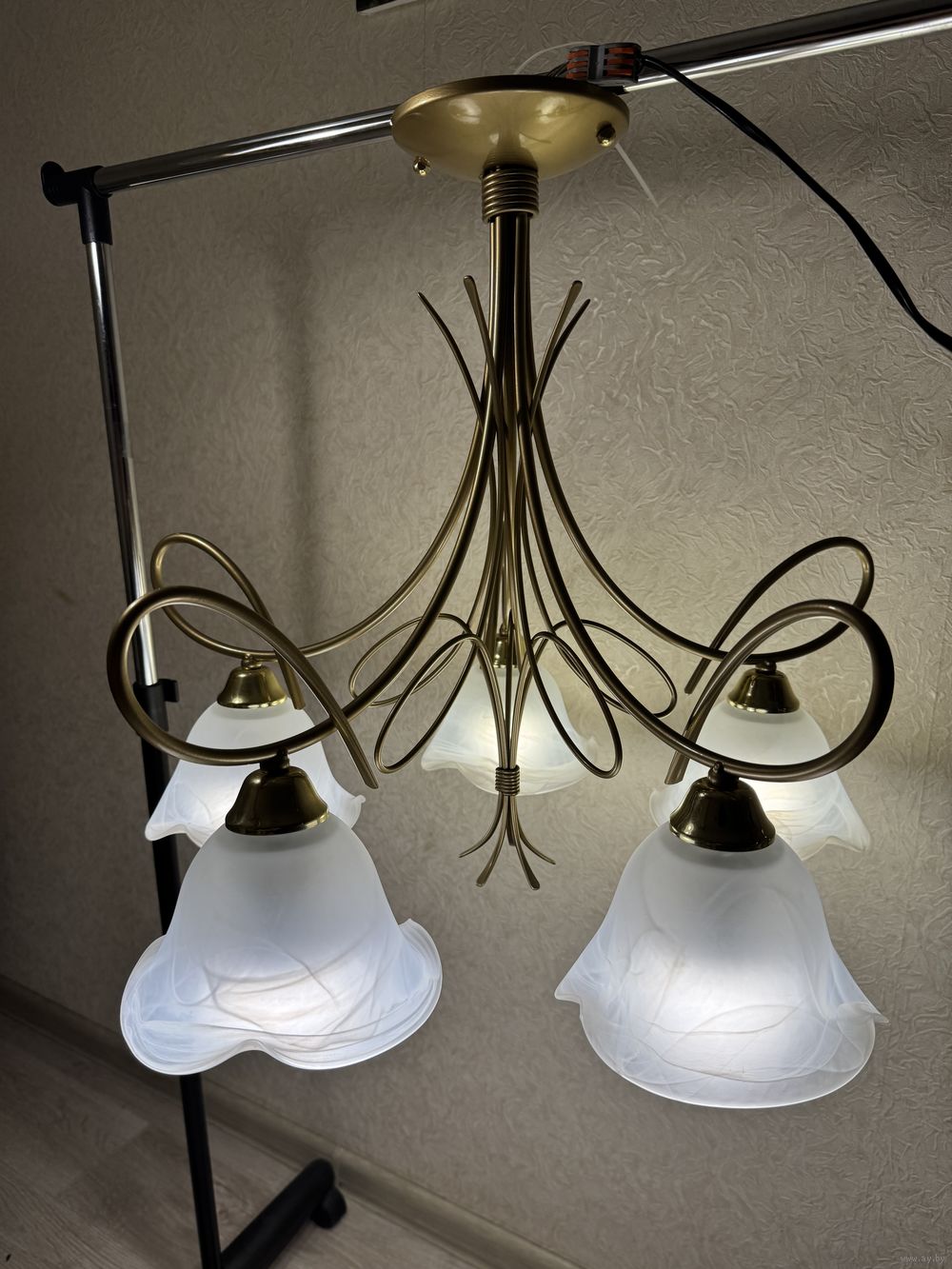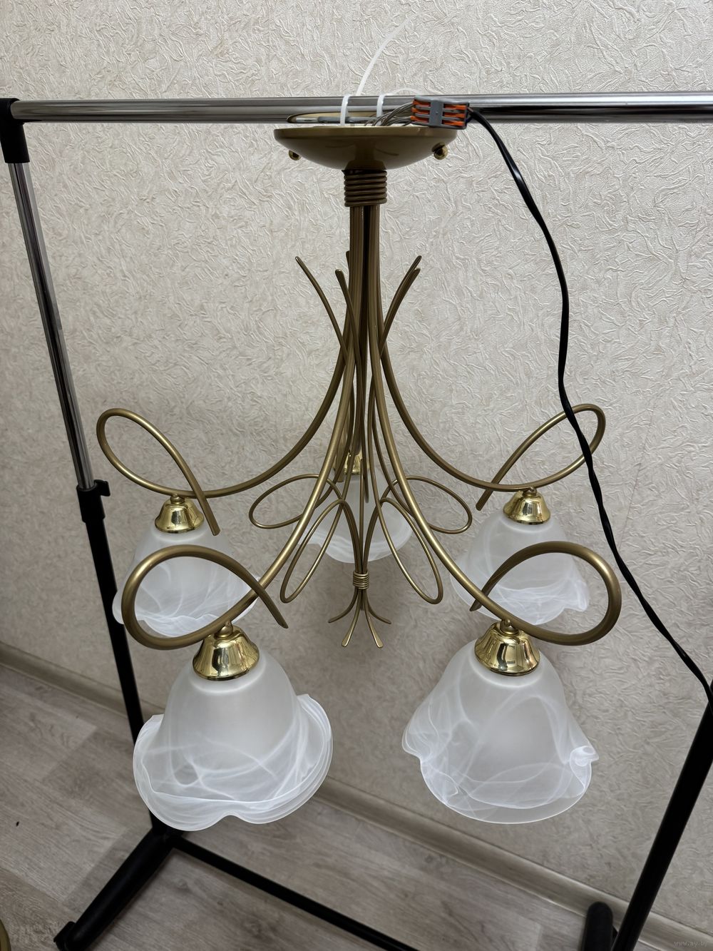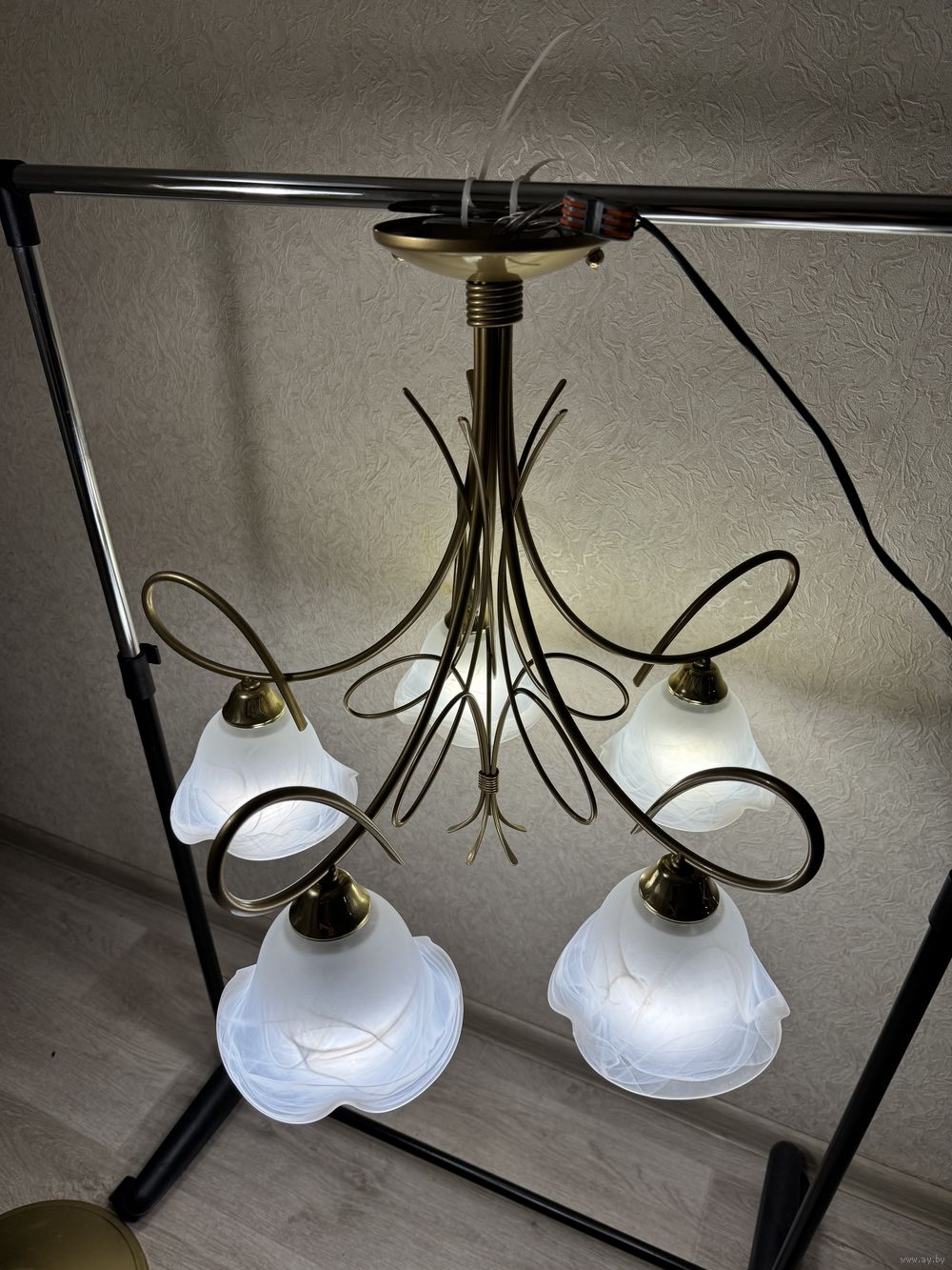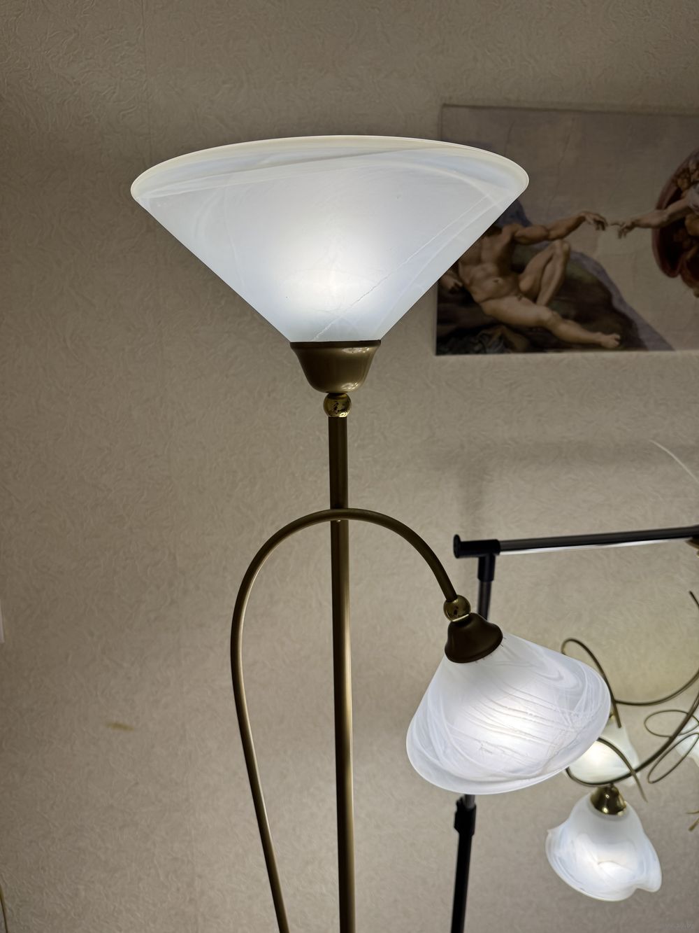 Продаётся комплект: б/у люстра и напольный торшер. Цвет золотистый, лампочки идут в комплекте.